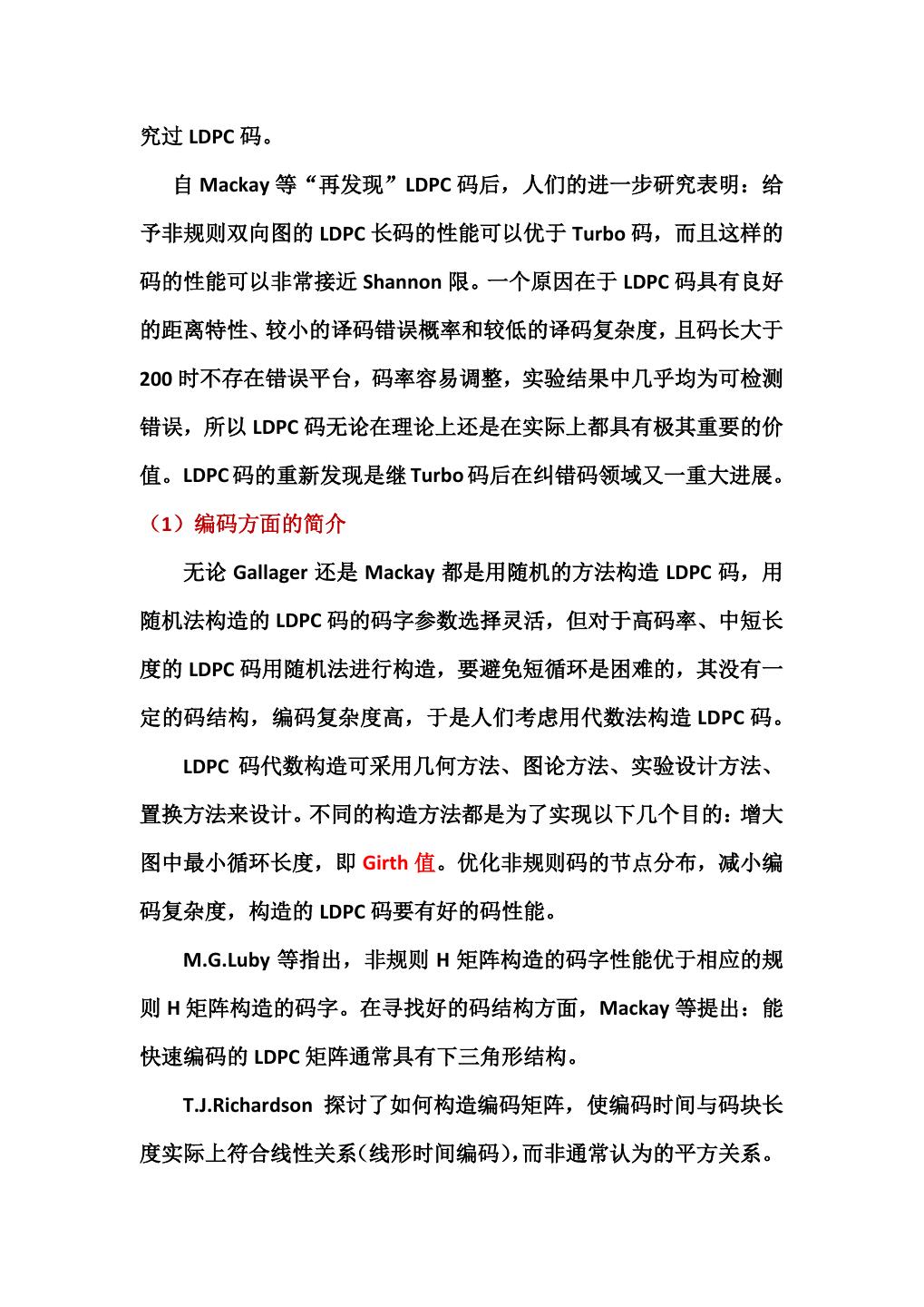 3 .究过 LDPC 码。 自 Mackay 等“再发现”LDPC 码后,人们的进一步研究表明:给 予非规则双向图的 LDPC 长码的性能可以优于 Turbo 码,而且这样的 码的性能可以非常接近 Shannon 限。一个原因在于 LDPC 码具有良好 的距离特性、较小的译码错误概率和较低的译码复杂度,且码长大于 200 时不存在错误平台,码率容易调整,实验结果中几乎均为可检测 错误,所以 LDPC 码无论在理论上还是在实际上都具有极其重要的价 值。LDPC 码的重新发现是继 Turbo 码后在纠错码领域又一重大进展。 (1)编码方面的简介 无论 Gallager 还是 Mackay 都是用随机的方法构造 LDPC 码,用 随机法构造的 LDPC 码的码字参数选择灵活,但对于高码率、中短长 度的 LDPC 码用随机法进行构造,要避免短循环是困难的,其没有一 定的码结构,编码复杂度高,于是人们考虑用代数法构造 LDPC 码。 LDPC 码代数构造可采用几何方法、图论方法、实验设计方法、 置换方法来设计。不同的构造方法都是为了实现以下几个目的:增大 图中最小循环长度,即 Girth 值。优化非规则码的节点分布,减小编 码复杂度,构造的 LDPC 码要有好的码性能。 M.G.Luby 等指出,非规则 H 矩阵构造的码字性能优于相应的规 则 H 矩阵构造的码字。在寻找好的码结构方面,Mackay 等提出:能 快速编码的 LDPC 矩阵通常具有下三角形结构。 T.J.Richardson 探讨了如何构造编码矩阵,使编码时间与码块长 度实际上符合线性关系(线形时间编码),而非通常认为的平方关系。