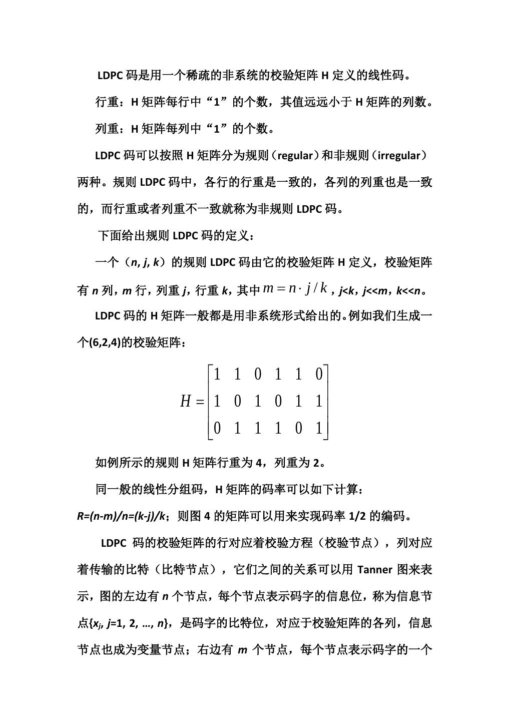 5 . LDPC 码是用一个稀疏的非系统的校验矩阵 H 定义的线性码。 行重:H 矩阵每行中“1”的个数,其值远远小于 H 矩阵的列数。 列重:H 矩阵每列中“1”的个数。 LDPC 码可以按照 H 矩阵分为规则(regular)和非规则(irregular) 两种。规则 LDPC 码中,各行的行重是一致的,各列的列重也是一致 的,而行重或者列重不一致就称为非规则 LDPC 码。 下面给出规则 LDPC 码的定义: 一个(n, j, k)的规则 LDPC 码由它的校验矩阵 H 定义,校验矩阵 有 n 列,m 行,列重 j,行重 k,其中 m= n ⋅ j / k ,j<k,j<<m,k<<n。 LDPC 码的 H 矩阵一般都是用非系统形式给出的。例如我们生成一 个(6,2,4)的校验矩阵: 1 1 0 1 1 0 H = 1 0 1 0 1 1 0 1 1 1 0 1 如例所示的规则 H 矩阵行重为 4,列重为 2。 同一般的线性分组码,H 矩阵的码率可以如下计算: R=(n-m)/n=(k-j)/k;则图 4 的矩阵可以用来实现码率 1/2 的编码。 LDPC 码的校验矩阵的行对应着校验方程(校验节点),列对应 着传输的比特(比特节点),它们之间的关系可以用 Tanner 图来表 示,图的左边有 n 个节点,每个节点表示码字的信息位,称为信息节 点{xj, j=1, 2, …, n},是码字的比特位,对应于校验矩阵的各列,信息 节点也成为变量节点;右边有 m 个节点,每个节点表示码字的一个