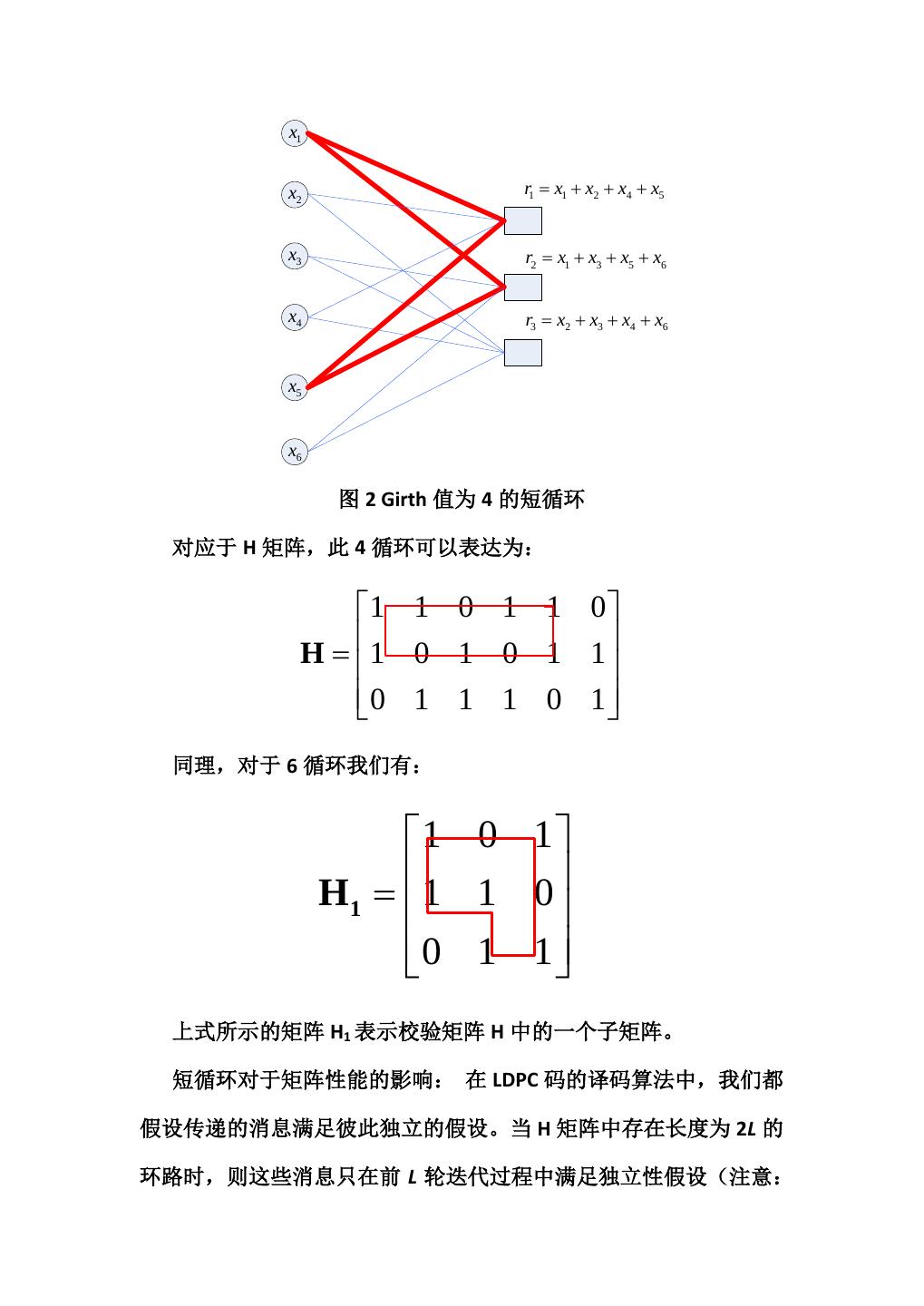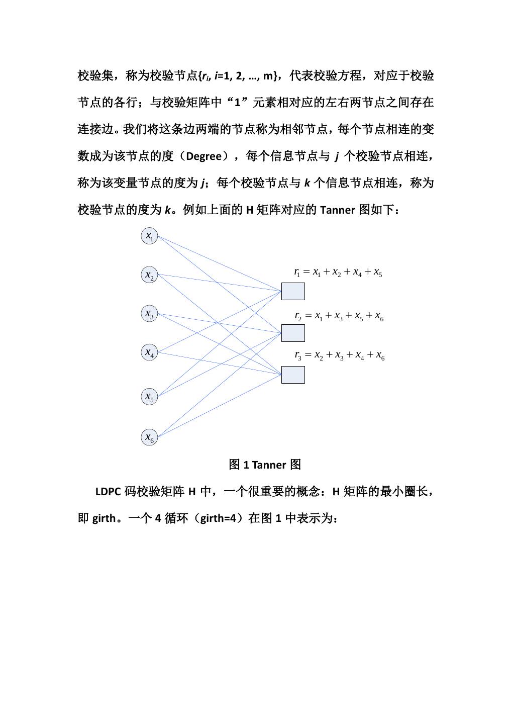 6 .校验集,称为校验节点{ri, i=1, 2, …, m},代表校验方程,对应于校验 节点的各行;与校验矩阵中“1”元素相对应的左右两节点之间存在 连接边。我们将这条边两端的节点称为相邻节点,每个节点相连的变 数成为该节点的度(Degree),每个信息节点与 j 个校验节点相连, 称为该变量节点的度为 j;每个校验节点与 k 个信息节点相连,称为 校验节点的度为 k。例如上面的 H 矩阵对应的 Tanner 图如下: x1 x2 r1 = x1 + x2 + x4 + x5 x3 r2 = x1 + x3 + x5 + x6 x4 r3 = x2 + x3 + x4 + x6 x5 x6 图 1 Tanner 图 LDPC 码校验矩阵 H 中,一个很重要的概念:H 矩阵的最小圈长, 即 girth。一个 4 循环(girth=4)在图 1 中表示为: