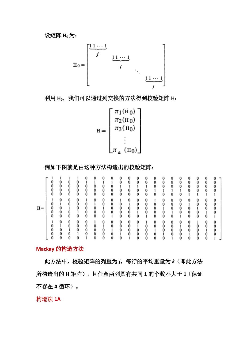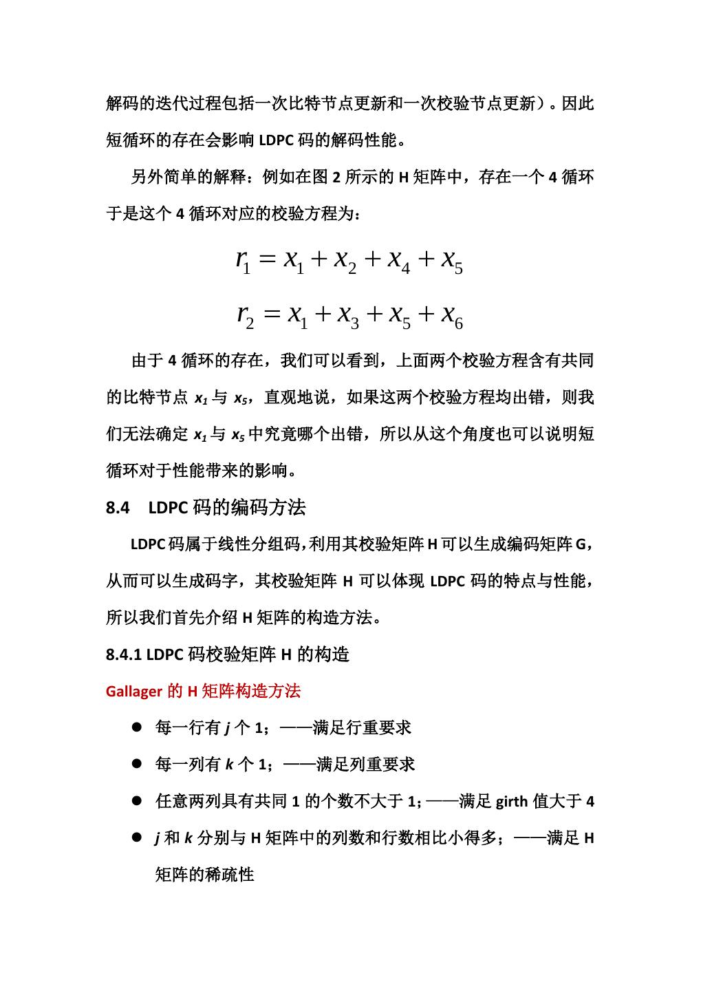 8 .解码的迭代过程包括一次比特节点更新和一次校验节点更新)。因此 短循环的存在会影响 LDPC 码的解码性能。 另外简单的解释:例如在图 2 所示的 H 矩阵中,存在一个 4 循环 于是这个 4 循环对应的校验方程为: r1 = x1 + x2 + x4 + x5 r2 = x1 + x3 + x5 + x6 由于 4 循环的存在,我们可以看到,上面两个校验方程含有共同 的比特节点 x1 与 x5,直观地说,如果这两个校验方程均出错,则我 们无法确定 x1 与 x5 中究竟哪个出错,所以从这个角度也可以说明短 循环对于性能带来的影响。 8.4 LDPC 码的编码方法 LDPC 码属于线性分组码,利用其校验矩阵 H 可以生成编码矩阵 G, 从而可以生成码字,其校验矩阵 H 可以体现 LDPC 码的特点与性能, 所以我们首先介绍 H 矩阵的构造方法。 8.4.1 LDPC 码校验矩阵 H 的构造 Gallager 的 H 矩阵构造方法 每一行有 j 个 1;——满足行重要求 每一列有 k 个 1;——满足列重要求 任意两列具有共同 1 的个数不大于 1;——满足 girth 值大于 4 j 和 k 分别与 H 矩阵中的列数和行数相比小得多;——满足 H 矩阵的稀疏性