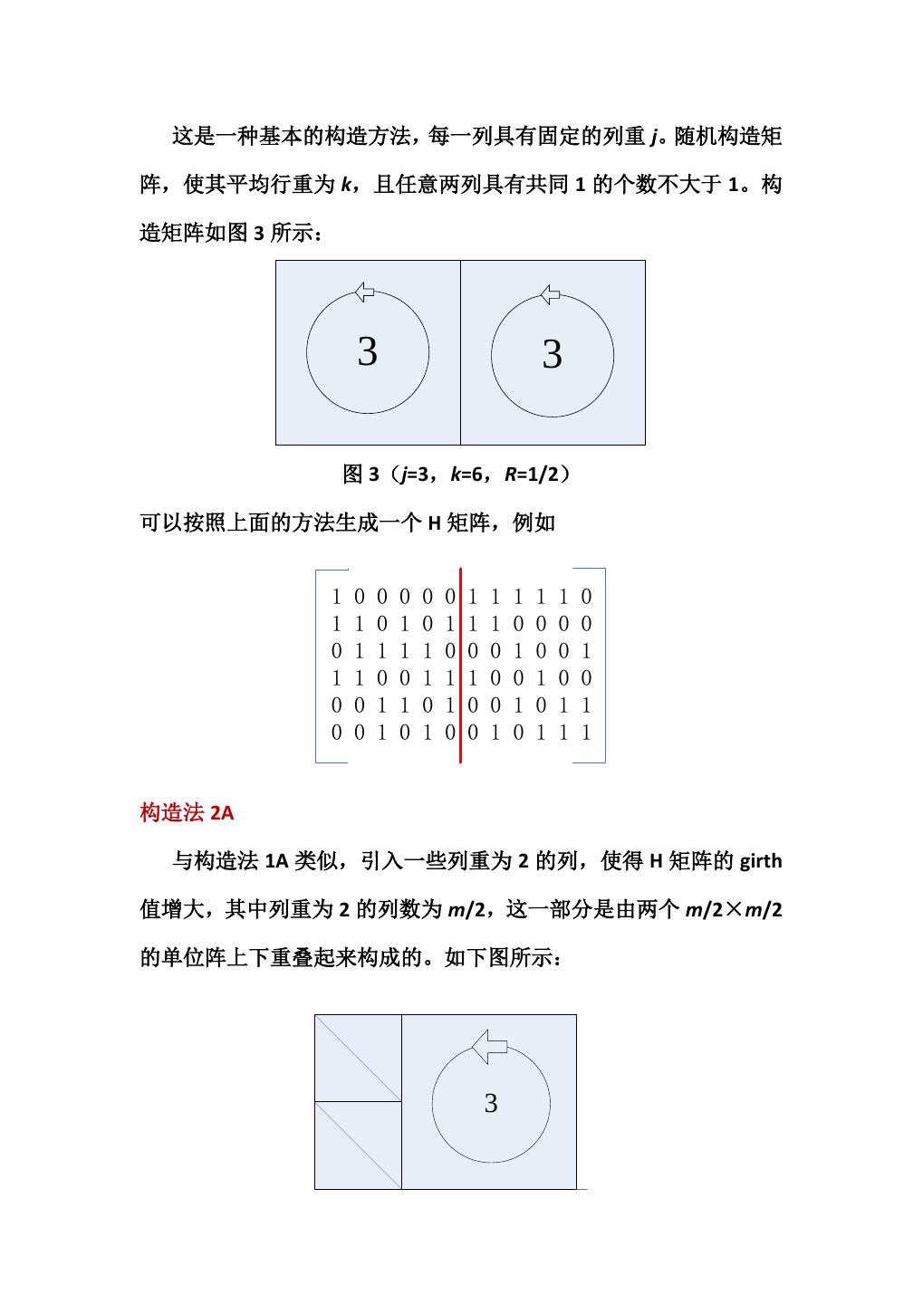 10 . 这是一种基本的构造方法,每一列具有固定的列重 j。随机构造矩 阵,使其平均行重为 k,且任意两列具有共同 1 的个数不大于 1。构 造矩阵如图 3 所示: 3 3 图 3(j=3,k=6,R=1/2) 可以按照上面的方法生成一个 H 矩阵,例如 1 0 0 0 0 0 1 1 1 1 1 0 1 1 0 1 0 1 1 1 0 0 0 0 0 1 1 1 1 0 0 0 1 0 0 1 1 1 0 0 1 1 1 0 0 1 0 0 0 0 1 1 0 1 0 0 1 0 1 1 0 0 1 0 1 0 0 1 0 1 1 1 构造法 2A 与构造法 1A 类似,引入一些列重为 2 的列,使得 H 矩阵的 girth 值增大,其中列重为 2 的列数为 m/2,这一部分是由两个 m/2×m/2 的单位阵上下重叠起来构成的。如下图所示: 3