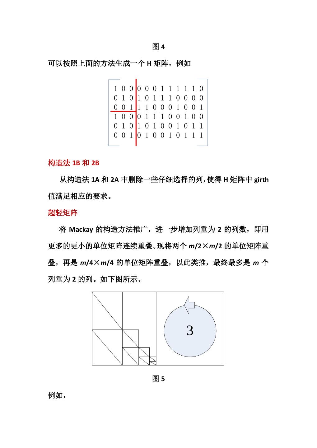 11 . 图4 可以按照上面的方法生成一个 H 矩阵,例如 1 0 0 0 0 0 1 1 1 1 1 0 0 1 0 1 0 1 1 1 0 0 0 0 0 0 1 1 1 0 0 0 1 0 0 1 1 0 0 0 1 1 1 0 0 1 0 0 0 1 0 1 0 1 0 0 1 0 1 1 0 0 1 0 1 0 0 1 0 1 1 1 构造法 1B 和 2B 从构造法 1A 和 2A 中删除一些仔细选择的列,使得 H 矩阵中 girth 值满足相应的要求。 超轻矩阵 将 Mackay 的构造方法推广,进一步增加列重为 2 的列数,即用 更多的更小的单位矩阵连续重叠。现将两个 m/2×m/2 的单位矩阵重 叠,再是 m/4×m/4 的单位矩阵重叠,以此类推,最终最多是 m 个 列重为 2 的列。如下图所示。 3 图5 例如,