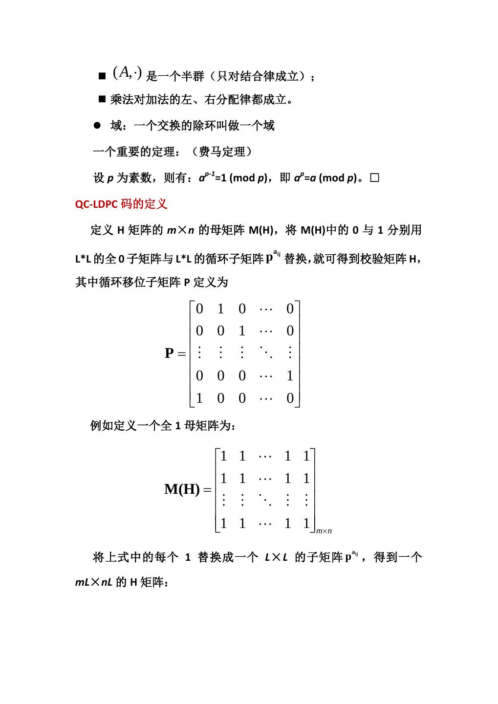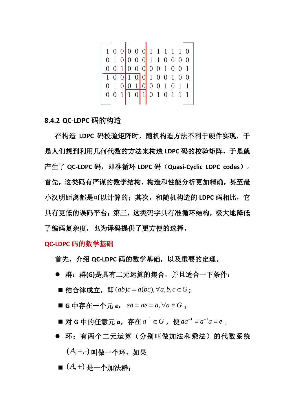12 . 1 0 0 0 0 0 1 1 1 1 1 0 0 1 0 0 0 0 1 1 0 0 0 0 0 0 1 0 0 0 0 0 1 0 0 1 1 0 0 1 0 0 1 0 0 1 0 0 0 1 0 0 1 0 0 0 1 0 1 1 0 0 1 1 0 1 0 1 0 1 1 1 8.4.2 QC-LDPC 码的构造 在构造 LDPC 码校验矩阵时,随机构造方法不利于硬件实现,于 是人们想到利用几何代数的方法来构造 LDPC 码的校验矩阵,于是就 产生了 QC-LDPC 码,即准循环 LDPC 码(Quasi-Cyclic LDPC codes)。 首先,这类码有严谨的数学结构,构造和性能分析更加精确,甚至最 小汉明距离都是可以计算的;其次,和随机构造的 LDPC 码相比,它 具有更低的误码平台;第三,这类码字具有准循环结构,极大地降低 了编码复杂度,也为译码提供了更方便的选择。 QC-LDPC 码的数学基础 首先,介绍 QC-LDPC 码的数学基础,以及重要的定理。 群:群(G)是具有二元运算的集合,并且适合一下条件: 结合律成立,即 (ab)c = a (bc), ∀a, b, c ∈ G ; G 中存在一个元 e: ea = ae = a, ∀a ∈ G ; −1 对 G 中的任意元 a,存在 a ∈ G ,使 aa −1 −1 = a= a e。 环:有两个二元运算(分别叫做加法和乘法)的代数系统 ( A, +, ⋅) 叫做一个环,如果 ( A, + ) 是一个加法群;