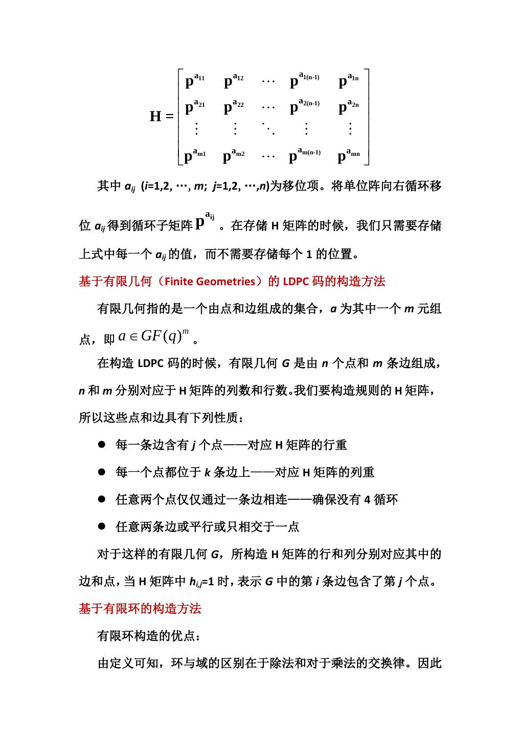 14 . pa11 pa12 p a1(n-1) pa1n a p 21 p 2(n-1) p a pa22 a 2n H= pam1 pam2 p am(n-1) pamn 其中 aij (i=1,2,…,m; j=1,2,…,n)为移位项。将单位阵向右循环移 aij 位 aij 得到循环子矩阵 p 。在存储 H 矩阵的时候,我们只需要存储 上式中每一个 aij 的值,而不需要存储每个 1 的位置。 基于有限几何(Finite Geometries)的 LDPC 码的构造方法 有限几何指的是一个由点和边组成的集合,a 为其中一个 m 元组 点,即 a ∈ GF (q ) 。 m 在构造 LDPC 码的时候,有限几何 G 是由 n 个点和 m 条边组成, n 和 m 分别对应于 H 矩阵的列数和行数。我们要构造规则的 H 矩阵, 所以这些点和边具有下列性质: 每一条边含有 j 个点——对应 H 矩阵的行重 每一个点都位于 k 条边上——对应 H 矩阵的列重 任意两个点仅仅通过一条边相连——确保没有 4 循环 任意两条边或平行或只相交于一点 对于这样的有限几何 G,所构造 H 矩阵的行和列分别对应其中的 边和点,当 H 矩阵中 hi,j=1 时,表示 G 中的第 i 条边包含了第 j 个点。 基于有限环的构造方法 有限环构造的优点: 由定义可知,环与域的区别在于除法和对于乘法的交换律。因此