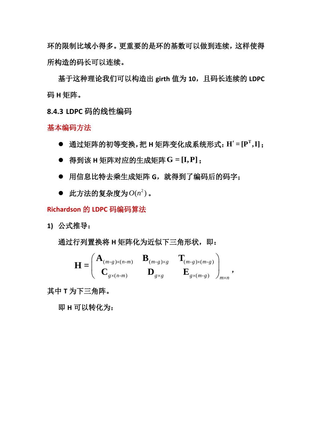 15 .环的限制比域小得多。更重要的是环的基数可以做到连续,这样使得 所构造的码长可以连续。 基于这种理论我们可以构造出 girth 值为 10,且码长连续的 LDPC 码 H 矩阵。 8.4.3 LDPC 码的线性编码 基本编码方法 通过矩阵的初等变换,把 H 矩阵变化成系统形式:H′ = [P , I] ; T 得到该 H 矩阵对应的生成矩阵 G = [I, P] ; 用信息比特去乘生成矩阵 G,就得到了编码后的码字; 2 此方法的复杂度为 O(n ) 。 Richardson 的 LDPC 码编码算法 1) 公式推导: 通过行列置换将 H 矩阵化为近似下三角形状,即: A ( m- g )×( n-m ) B ( m- g )× g T( m- g )×( m- g ) H= , C g ×( n - m ) Dg×g E g ×( m - g ) m×n 其中 T 为下三角阵。 即 H 可以转化为: