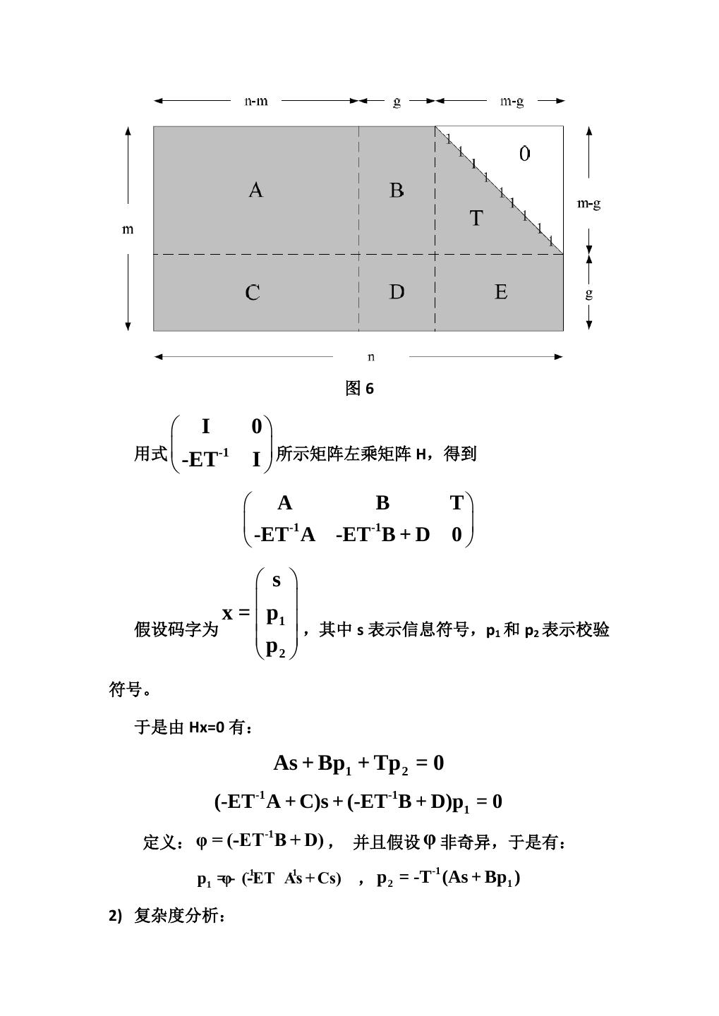 16 . 图6 I 0 用式 -ET-1 I 所示矩阵左乘矩阵 H,得到 A B T -1 -1 -ET A -ET B + D 0 s x = p1 假设码字为 p ,其中 s 表示信息符号,p1 和 p2 表示校验 2 符号。 于是由 Hx=0 有: As + Bp1 + Tp 2 = 0 (-ET-1 A + C)s + (-ET-1B + D)p1 = 0 定义: φ = (-ET B + D) , 并且假设 φ 非奇异,于是有: -1 p1 =φ- (-ET As + Cs) , p 2 = -T (As + Bp1 ) -1 -1 -1 2) 复杂度分析: