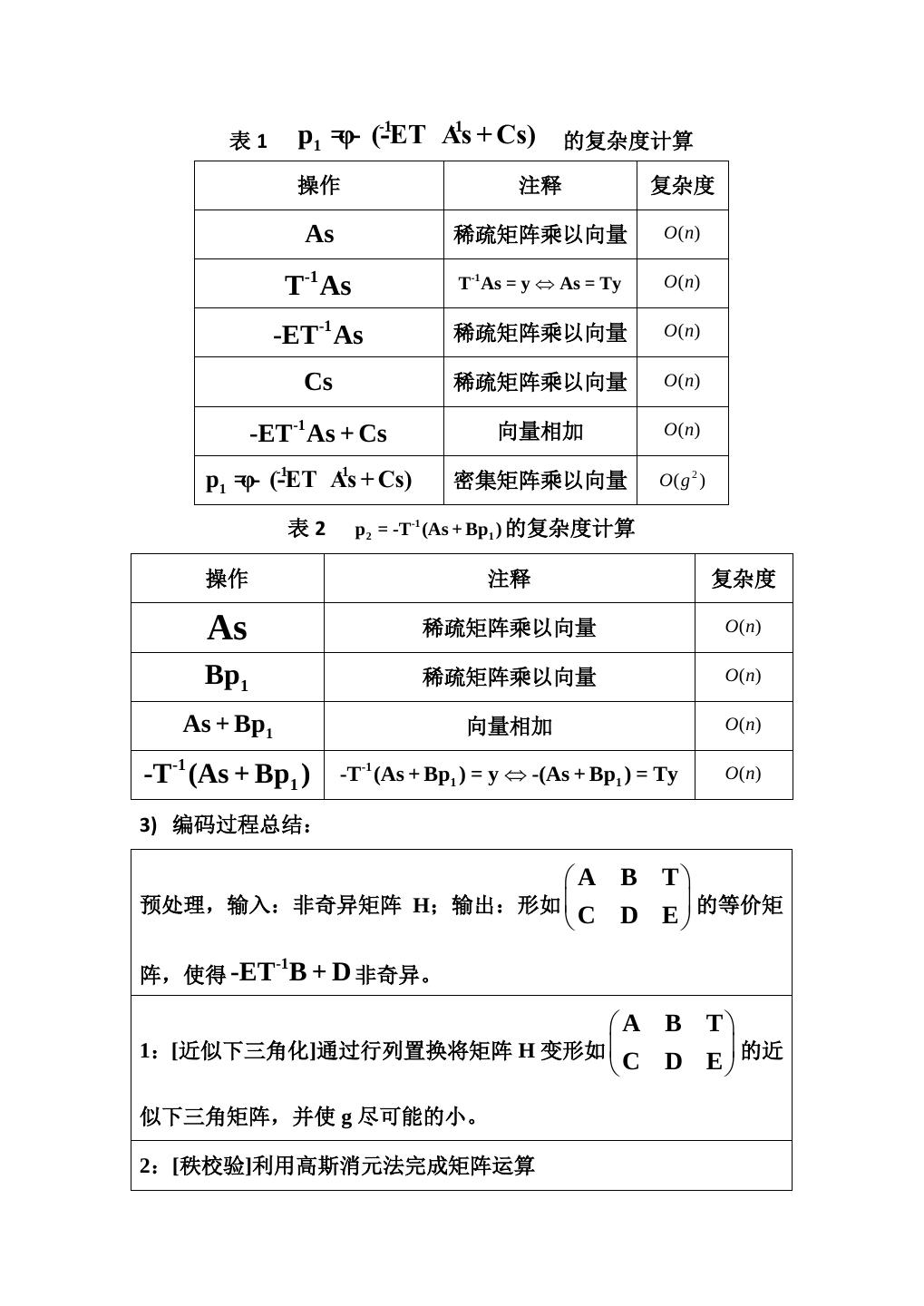 17 . 表1 p1 =φ- (-ET -1 As -1 + Cs) 的复杂度计算 操作 注释 复杂度 As 稀疏矩阵乘以向量 O ( n) T-1 As T-1 As = y ⇔ As = Ty O ( n) -ET-1 As 稀疏矩阵乘以向量 O ( n) Cs 稀疏矩阵乘以向量 O ( n) -ET-1 As + Cs 向量相加 O ( n) p1 =φ- (-ET -1 As -1 + Cs) 密集矩阵乘以向量 O( g 2 ) 表2 p 2 = -T-1 (As + Bp1 ) 的复杂度计算 操作 注释 复杂度 As 稀疏矩阵乘以向量 O ( n) Bp1 稀疏矩阵乘以向量 O ( n) As + Bp1 向量相加 O ( n) -T-1 (As + Bp1 ) -T-1 (As + Bp1 ) = y ⇔ -(As + Bp1 ) = Ty O ( n) 3) 编码过程总结: A B T 预处理,输入:非奇异矩阵 H;输出:形如 的等价矩 C D E -1 阵,使得 -ET B + D 非奇异。 A B T 1:[近似下三角化]通过行列置换将矩阵 H 变形如 的近 C D E 似下三角矩阵,并使 g 尽可能的小。 2:[秩校验]利用高斯消元法完成矩阵运算