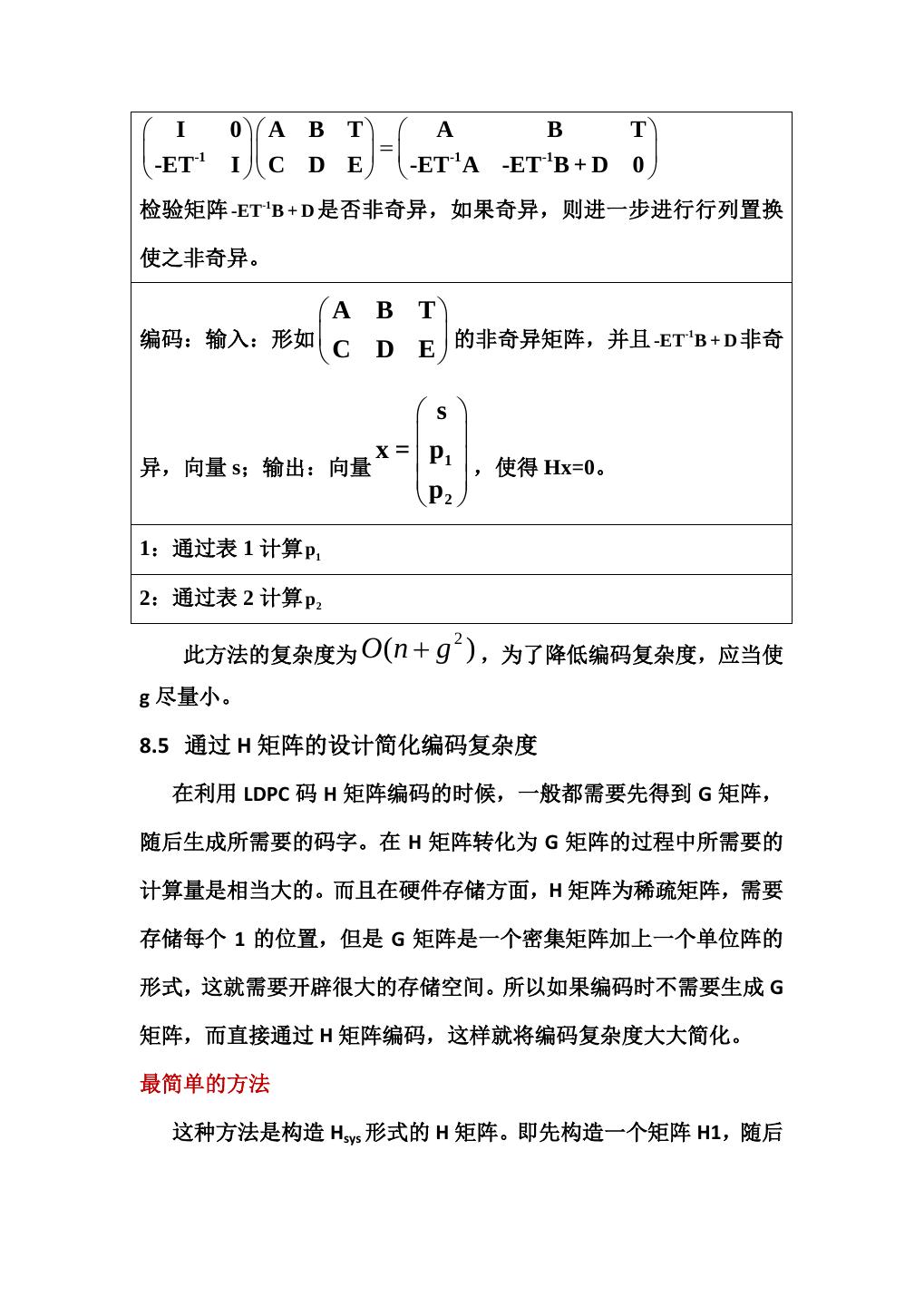 18 . I 0 A B T A B T -1 = -ET I C D E -ET-1 A -ET-1B + D 0 检验矩阵 -ET-1B + D 是否非奇异,如果奇异,则进一步进行行列置换 使之非奇异。 A B T 编码:输入:形如 的非奇异矩阵,并且 -ET-1B + D 非奇 C D E s x = p1 异,向量 s;输出:向量 ,使得 Hx=0。 p 2 1:通过表 1 计算 p1 2:通过表 2 计算 p 2 此方法的复杂度为 O ( n + g 2 ) ,为了降低编码复杂度,应当使 g 尽量小。 8.5 通过 H 矩阵的设计简化编码复杂度 在利用 LDPC 码 H 矩阵编码的时候,一般都需要先得到 G 矩阵, 随后生成所需要的码字。在 H 矩阵转化为 G 矩阵的过程中所需要的 计算量是相当大的。而且在硬件存储方面,H 矩阵为稀疏矩阵,需要 存储每个 1 的位置,但是 G 矩阵是一个密集矩阵加上一个单位阵的 形式,这就需要开辟很大的存储空间。所以如果编码时不需要生成 G 矩阵,而直接通过 H 矩阵编码,这样就将编码复杂度大大简化。 最简单的方法 这种方法是构造 Hsys 形式的 H 矩阵。即先构造一个矩阵 H1,随后