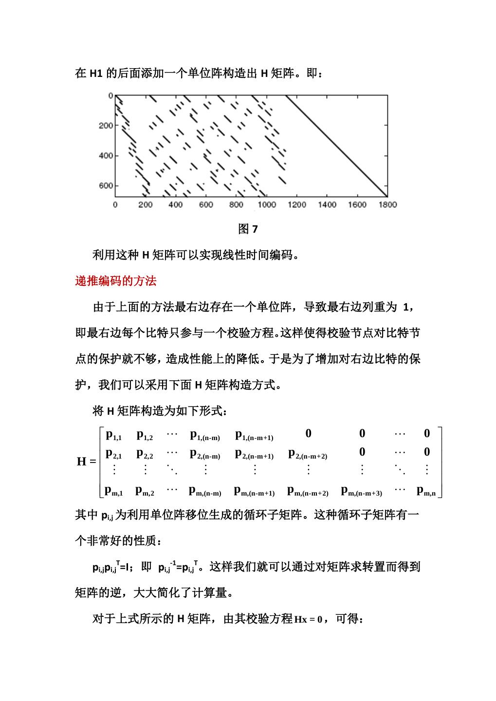 19 .在 H1 的后面添加一个单位阵构造出 H 矩阵。即: 图7 利用这种 H 矩阵可以实现线性时间编码。 递推编码的方法 由于上面的方法最右边存在一个单位阵,导致最右边列重为 1, 即最右边每个比特只参与一个校验方程。这样使得校验节点对比特节 点的保护就不够,造成性能上的降低。于是为了增加对右边比特的保 护,我们可以采用下面 H 矩阵构造方式。 将 H 矩阵构造为如下形式: p1,1 p1,2 p1,(n-m) p1,(n-m+1) 0 0 0 p p 2,2 p 2,(n-m) p 2,(n-m+1) p 2,(n-m+2) 0 0 H= 2,1 pm,1 pm,2 pm,(n-m) pm,(n-m+1) pm,(n-m+2) pm,(n-m+3) pm,n 其中 pi,j 为利用单位阵移位生成的循环子矩阵。这种循环子矩阵有一 个非常好的性质: pi,jpi,jT=I;即 pi,j-1=pi,jT。这样我们就可以通过对矩阵求转置而得到 矩阵的逆,大大简化了计算量。 对于上式所示的 H 矩阵,由其校验方程 Hx = 0 ,可得: