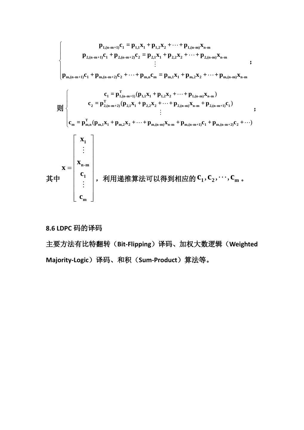 20 . p1,(n-m+1)c1 = p1,1 x1 + p1,2 x 2 + + p1,(n-m) xn-m p 2,(n-m+1)c1 + p 2,(n-m+2)c 2 = p 2,1 x1 + p 2,2 x 2 + + p 2,(n-m) xn-m ; pm,(n-m+1)c1 + pm,(n-m+2)c 2 + + pm,ncm = pm,1 x1 + pm,2 x 2 + + pm,(n-m) xn-m T c1 = p1,(n-m+1) (p1,1 x1 + p1,2 x 2 + + p1,(n-m) xn-m ) c 2 = p T2,(n-m+2) (p 2,1 x1 + p 2,2 x 2 + + p 2,(n-m) xn-m + p 2,(n-m+1)c1 ) 则 ; cm = pm,n T (pm,1 x1 + pm,2 x 2 + + pm,(n-m) xn-m + pm,(n-m+1)c1 + pm,(n-m+2)c 2 + ) x1 x x = n-m 其中 c1 ,利用递推算法可以得到相应的 c1 , c 2 , , cm 。 cm 8.6 LDPC 码的译码 主要方法有比特翻转(Bit-Flipping)译码、加权大数逻辑(Weighted Majority-Logic)译码、和积(Sum-Product)算法等。