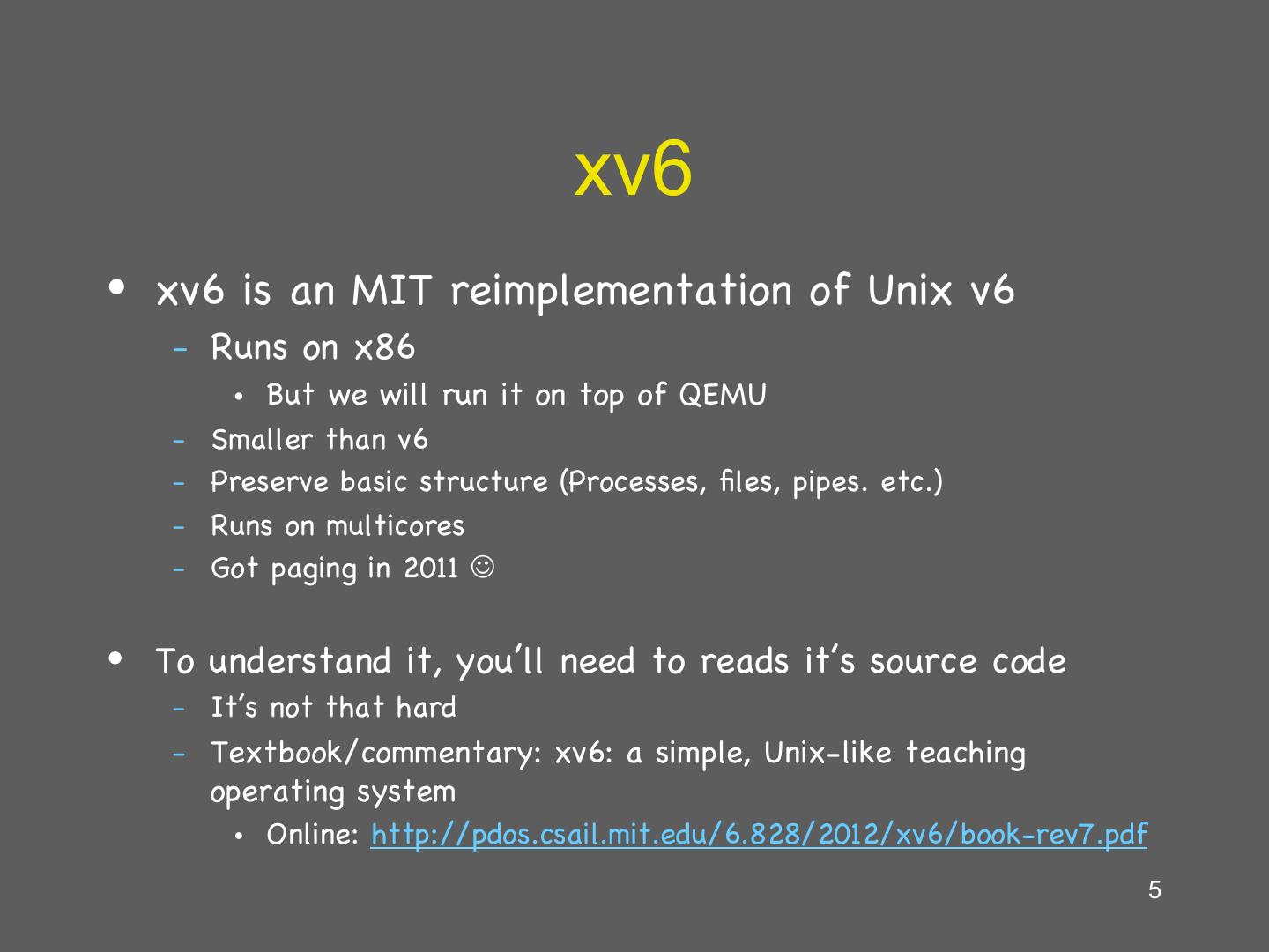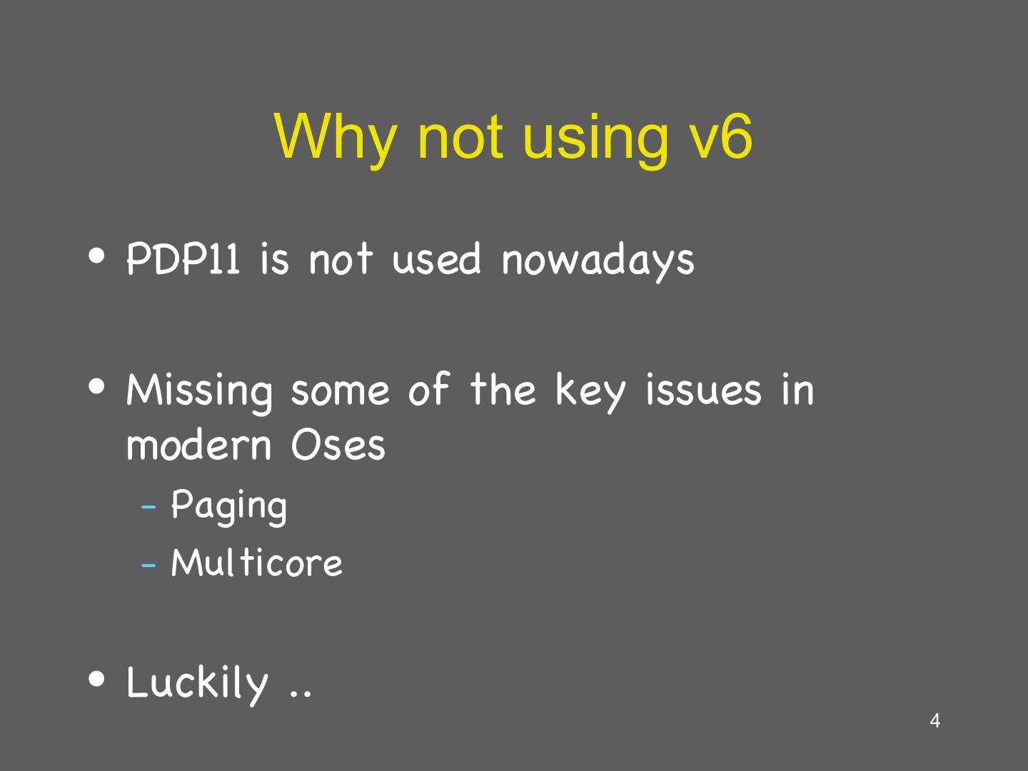 4 . Why not using v6 • PDP11 is not used nowadays • Missing some of the key issues in modern Oses – Paging – Multicore • Luckily .. 4
