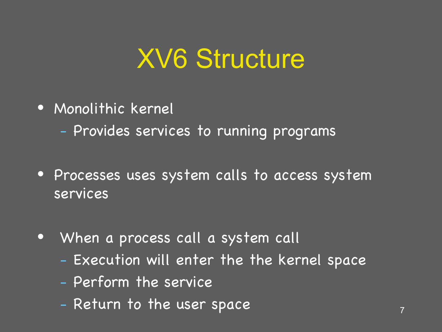 7 . XV6 Structure • Monolithic kernel – Provides services to running programs • Processes uses system calls to access system services • When a process call a system call – Execution will enter the the kernel space – Perform the service – Return to the user space 7