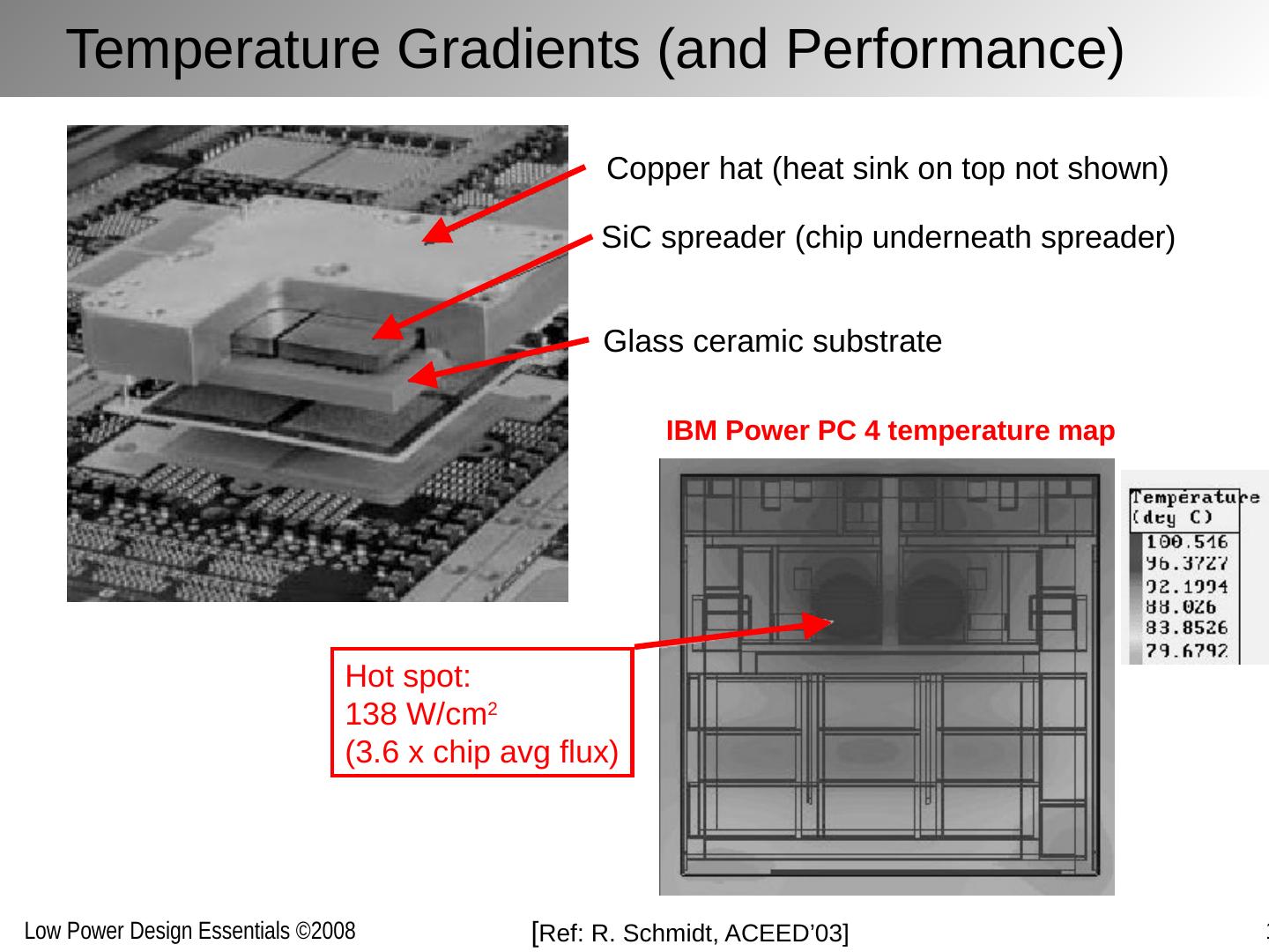 6 .Temperature Gradients (and Performance) IBM Power PC 4 temperature map [ Ref: R. Schmidt, ACEED’03] Hot spot: 138 W/cm 2 (3.6 x chip avg flux) Glass ceramic substrate SiC spreader (chip underneath spreader) Copper hat (heat sink on top not shown)