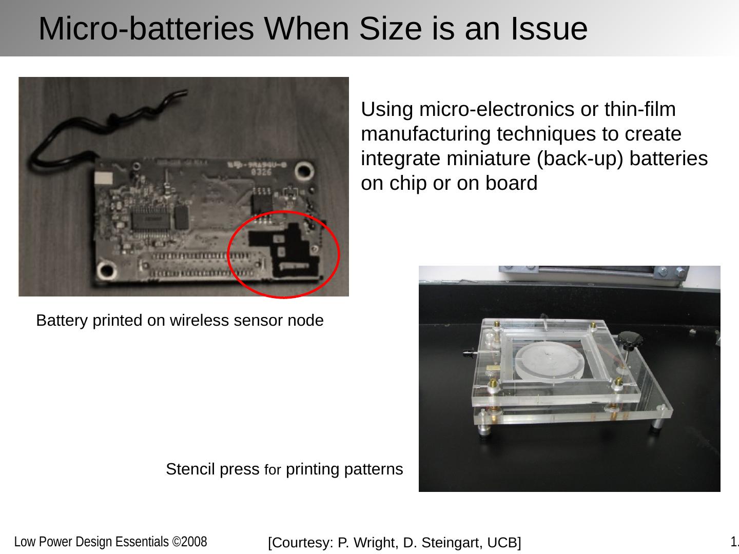 14 .Micro-batteries When Size is an Issue Battery printed on wireless sensor node Using micro-electronics or thin-film manufacturing techniques to create integrate miniature (back-up) batteries on chip or on board Stencil press for printing patterns [Courtesy: P. Wright, D. Steingart , UCB]