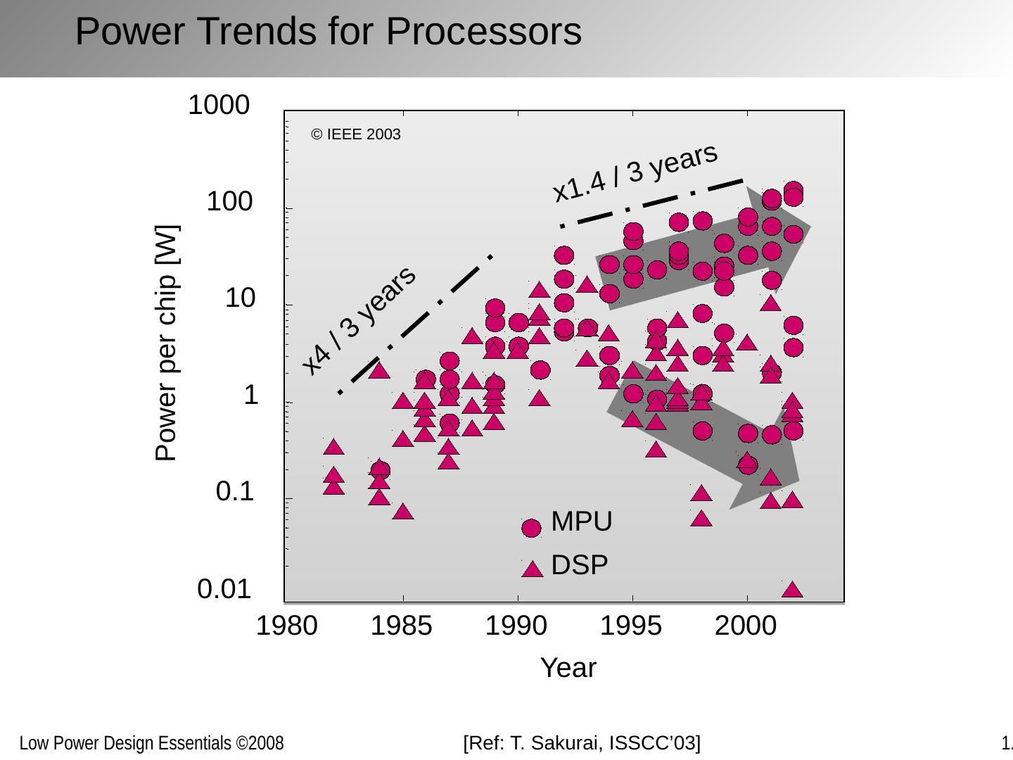 23 .Power Trends for Processors [Ref: T. Sakurai, ISSCC’03] Power per chip [W] 1980 1985 1990 1995 2000 0.01 0.1 1 10 100 1000 Year MPU x4 / 3 years DSP x1.4 / 3 years © IEEE 2003