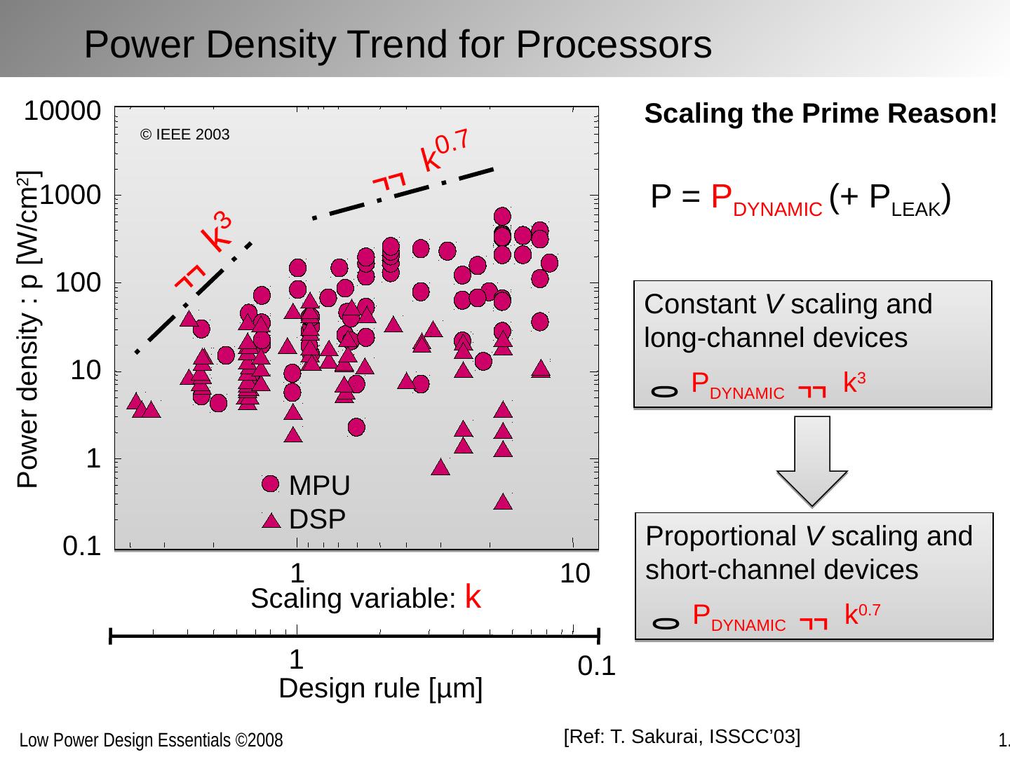 24 .Power Density Trend for Processors P = P DYNAMIC (+ P LEAK ) [Ref: T. Sakurai, ISSCC’03 ] Scaling the Prime Reason! Power density : p [W/cm 2 ] 0.1 1 10 100 1000 1 10 Design rule [ µ m] 0.1 1 Scaling variable: k k 3 10000 k 0.7 MPU DSP Constant V scaling and long-channel devices P DYNAMIC k 3 Proportional V scaling and short-channel devices P DYNAMIC k 0.7 © IEEE 2003