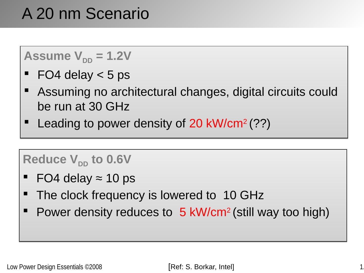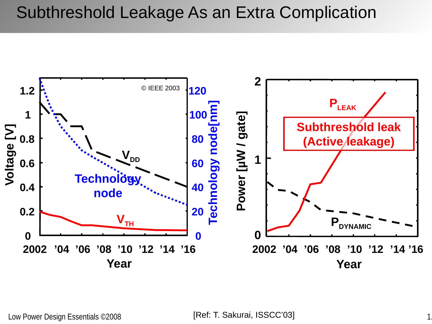 26 . Subthreshold Leakage As an Extra Complication Year 2002 ’04 ’06 ’08 ’10 ’12 ’14 ’16 0 0.2 0.4 0.6 0.8 1 1.2 0 20 40 60 80 100 120 Technology node[nm] Voltage [V] V TH V DD Technology node 2002 ’04 ’06 ’08 ’10 ’12 ’14 ’16 0 1 2 Year P DYNAMIC P LEAK Power [ µ W / gate] Subthreshold leak (Active leakage) [Ref: T. Sakurai, ISSCC’03 ] © IEEE 2003