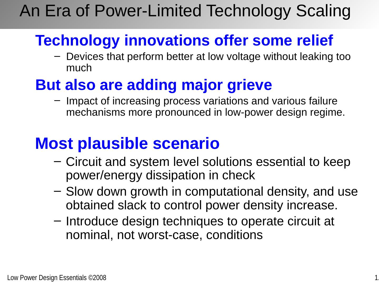 2 .Why Worry about Power? Total Energy of Milky Way Galaxy: 10 59 J Minimum switching energy for digital gate (1 electron@100 mV): 1.6 10 -20 J (limited by thermal noise) Upper bound on number of digital operations: 6 10 78 Operations/year performed by 1 billion 100 MOPS computers: 3 10 24 Energy consumed in 180 years , assuming a doubling of computational requirements every year (Moore’s Law). The Tongue-in-Cheek Answer