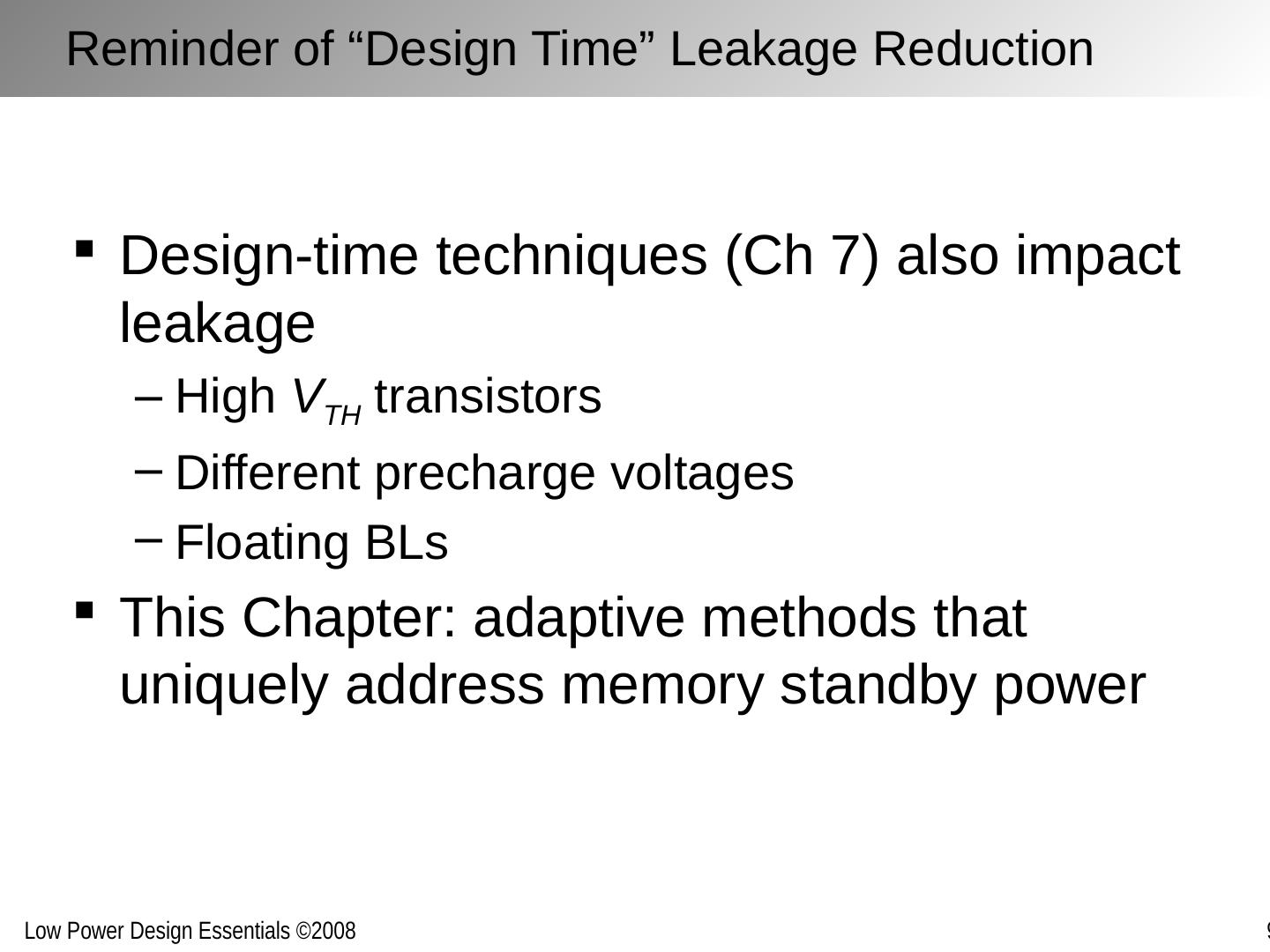 4 .Reminder of “Design Time” Leakage Reduction Design-time techniques (Ch 7) also impact leakage High V TH transistors Different precharge voltages Floating BLs This Chapter: adaptive methods that uniquely address memory standby power