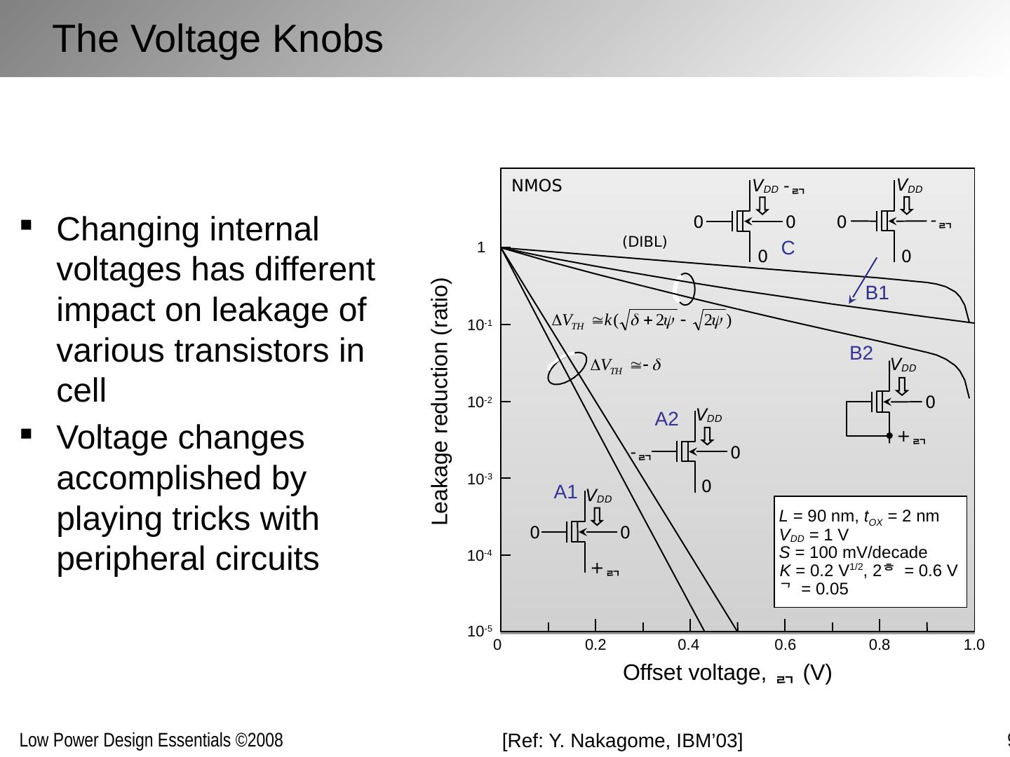 5 .The Voltage Knobs Changing internal voltages has different impact on leakage of various transistors in cell Voltage changes accomplished by playing tricks with peripheral circuits [Ref: Y. Nakagome , IBM’03 ] Offset voltage, (V) Leakage reduction (ratio) 1 10 -1 10 -2 10 -3 10 -4 0 0.2 0.4 0.6 0.8 1.0 10 -5 L = 90 nm, t OX = 2 nm V DD = 1 V S = 100 mV/decade K = 0.2 V 1/2 , 2 = 0.6 V = 0.05 V DD 0 0 - V DD 0 0 - V DD + 0 V DD - 0 0 0 (DIBL) NMOS V DD 0 0 + C B1 B2 A1 A2
