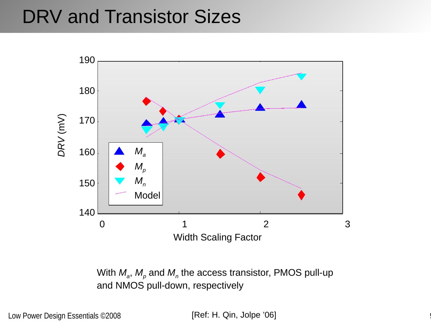 9 .DRV and Transistor Sizes 0 1 2 3 140 150 160 170 180 190 Width Scaling Factor DRV (mV) M a M p M n Model With M a , M p and M n the access transistor, PMOS pull-up and NMOS pull-down, respectively [Ref: H. Qin, Jolpe ’06]