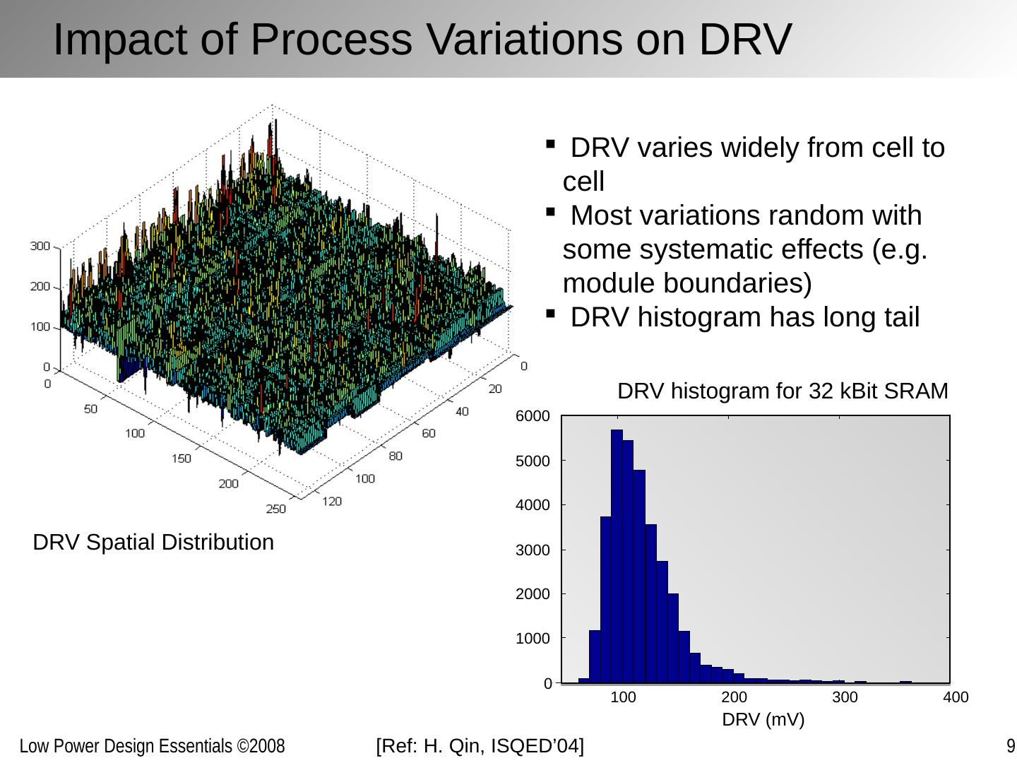 11 .Impact of Process Variations on DRV DRV Spatial Distribution DRV histogram for 32 kBit SRAM DRV varies widely from cell to cell Most variations random with some systematic effects (e.g. module boundaries) DRV histogram has long tail 130 nm CMOS [Ref: H. Qin, ISQED’04] 100 200 300 400 0 1000 2000 3000 4000 5000 6000 DRV (mV)