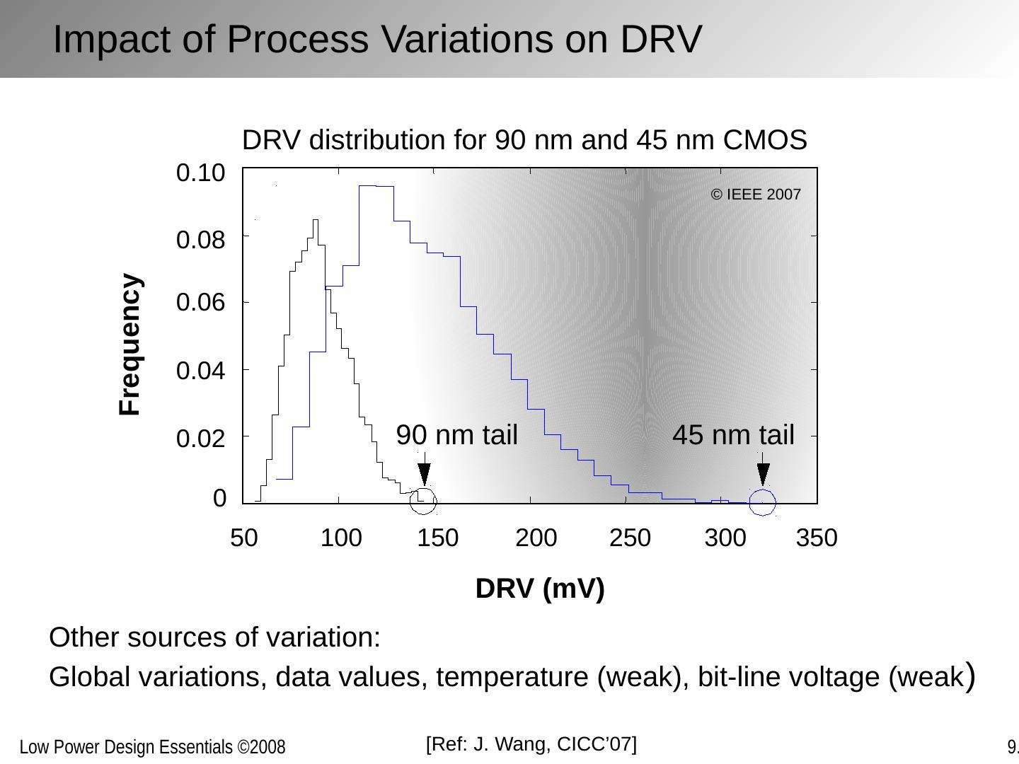 12 .Impact of Process Variations on DRV [Ref: J. Wang, CICC’07] DRV (mV) Frequency 50 100 150 200 250 300 350 45 nm tail 90 nm tail 0 0.02 0.04 0.06 0.08 0.10 Other sources of variation: Global variations, data values, temperature (weak), bit-line voltage (weak ) DRV distribution for 90 nm and 45 nm CMOS © IEEE 2007
