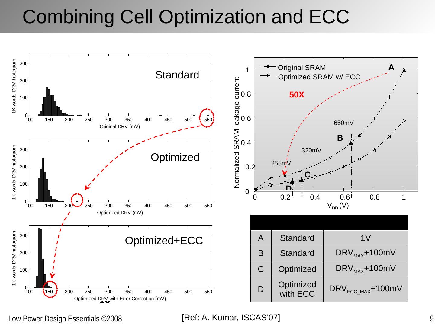 16 .Combining Cell Optimization and ECC - 16 - A B C D 650mV 320mV 255mV 50X Standard Optimized Optimized+ECC 0 0.2 0.4 0.6 0.8 1 0 0.2 0.4 0.6 0.8 1 V DD (V) Normalized SRAM leakage current Original SRAM Optimized SRAM w/ ECC SRAM Standby V DD A Standard 1V B Standard DRV MAX +100mV C Optimized DRV MAX +100mV D Optimized with ECC DRV ECC_MAX +100mV [Ref: A. Kumar, ISCAS’07]