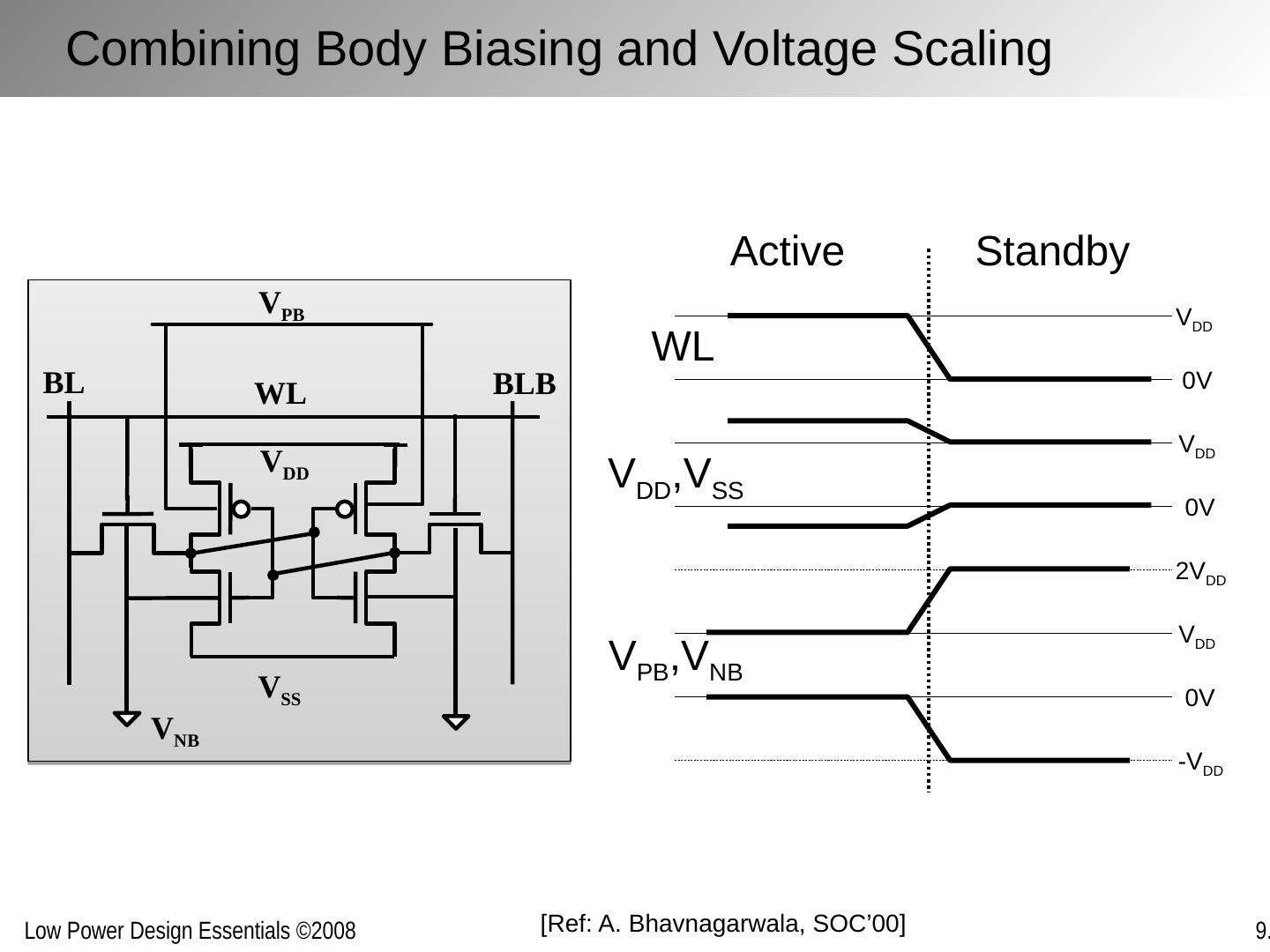 21 .Combining Body Biasing and Voltage Scaling 0V V DD 0V V DD 0V V DD 2V DD -V DD Active Standby WL V DD ,V SS V PB ,V NB BL BLB WL V DD V SS V PB V NB [Ref: A. Bhavnagarwala , SOC’00]