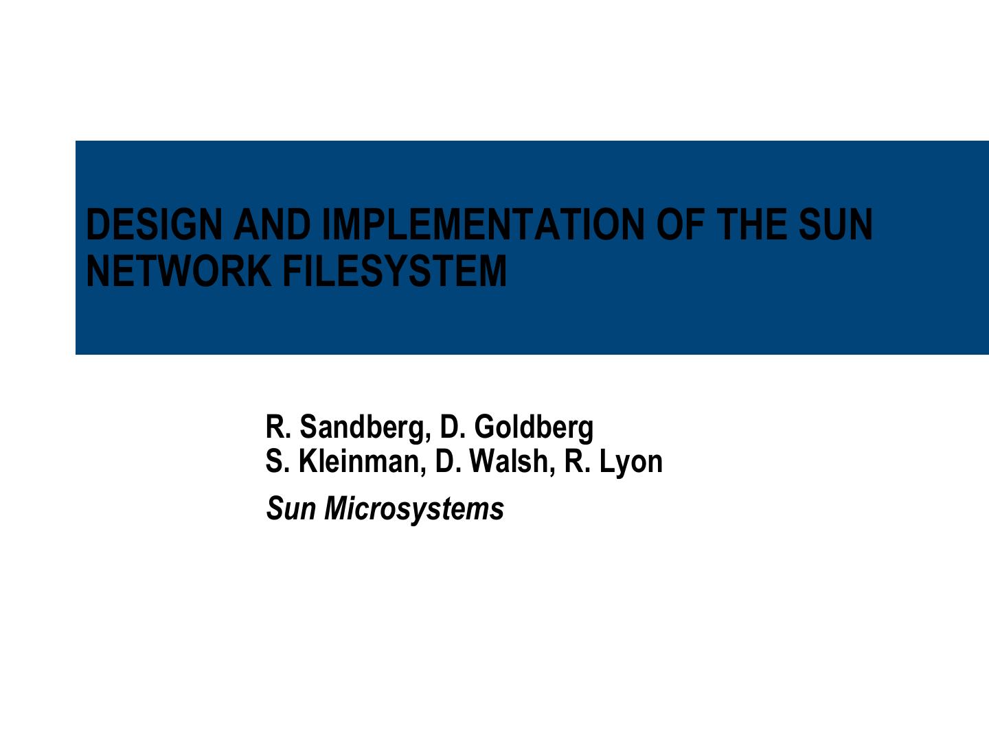 2 .DESIGN AND IMPLEMENTATION OF THE SUN NETWORK FILESYSTEM R. Sandberg, D. Goldberg S. Kleinman, D. Walsh, R. Lyon Sun Microsystems