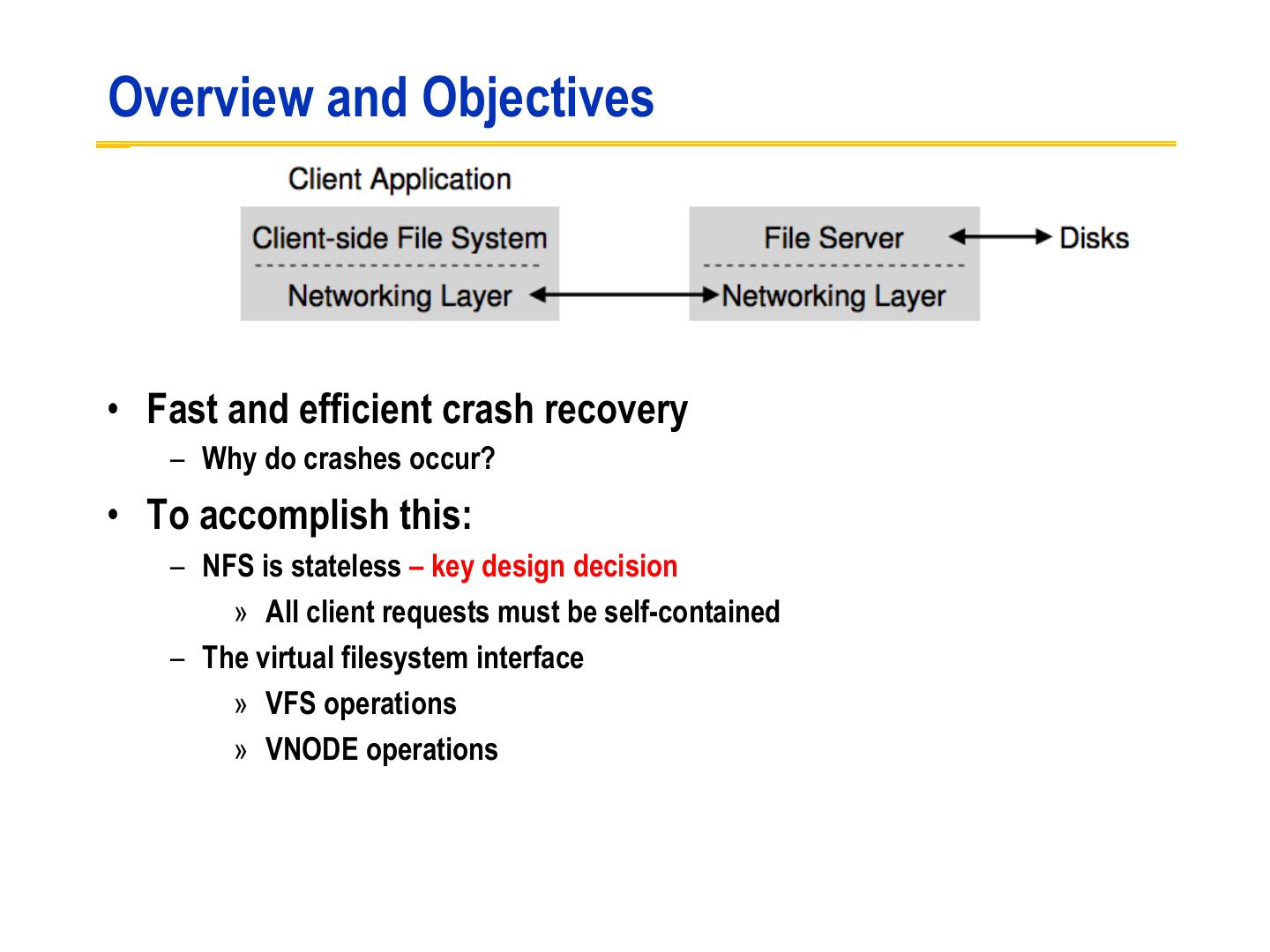 4 .Overview and Objectives • Fast and efficient crash recovery – Why do crashes occur? • To accomplish this: – NFS is stateless – key design decision » All client requests must be self-contained – The virtual filesystem interface » VFS operations » VNODE operations