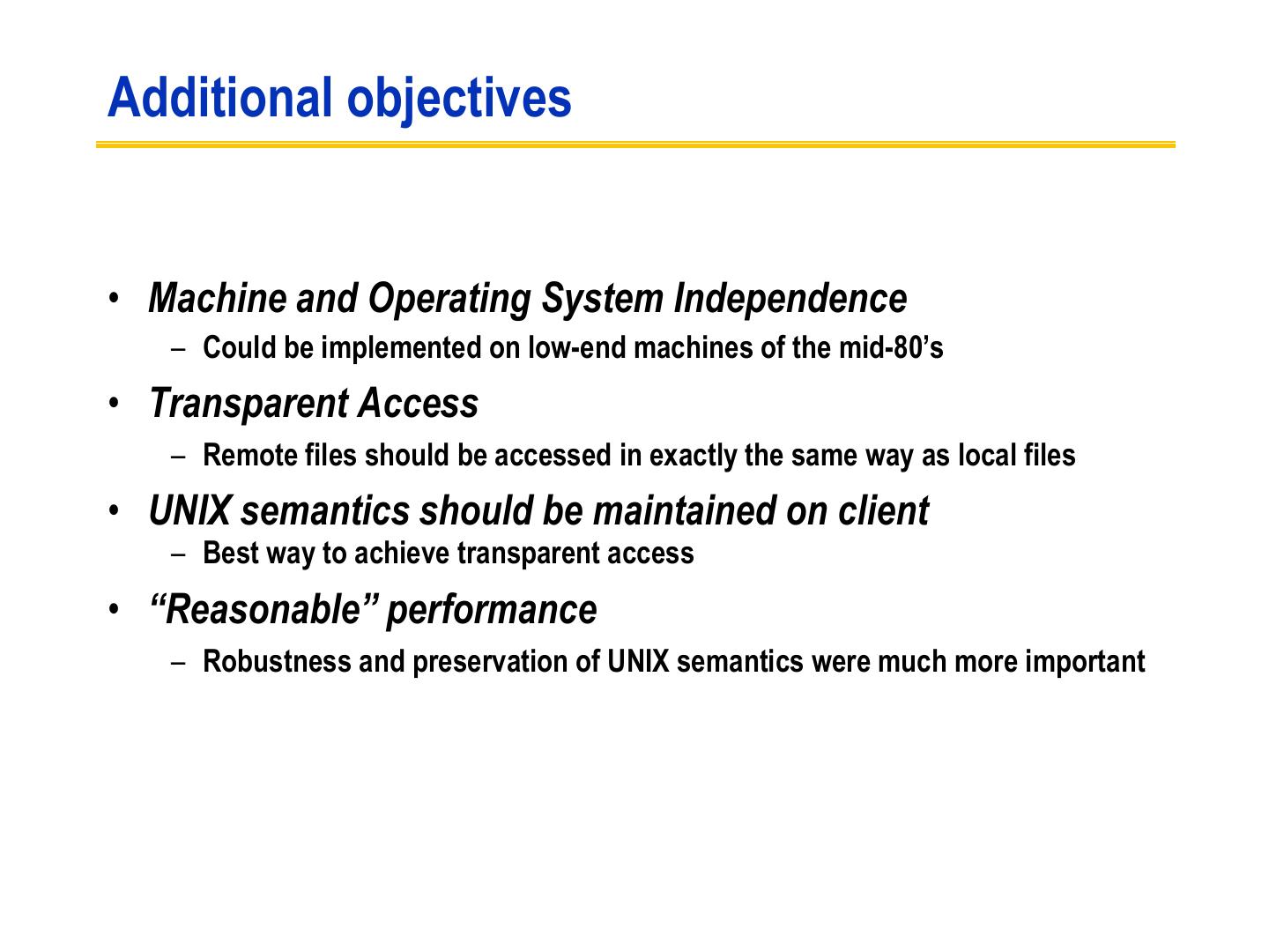 5 .Additional objectives • Machine and Operating System Independence – Could be implemented on low-end machines of the mid-80’s • Transparent Access – Remote files should be accessed in exactly the same way as local files • UNIX semantics should be maintained on client – Best way to achieve transparent access • “Reasonable” performance – Robustness and preservation of UNIX semantics were much more important