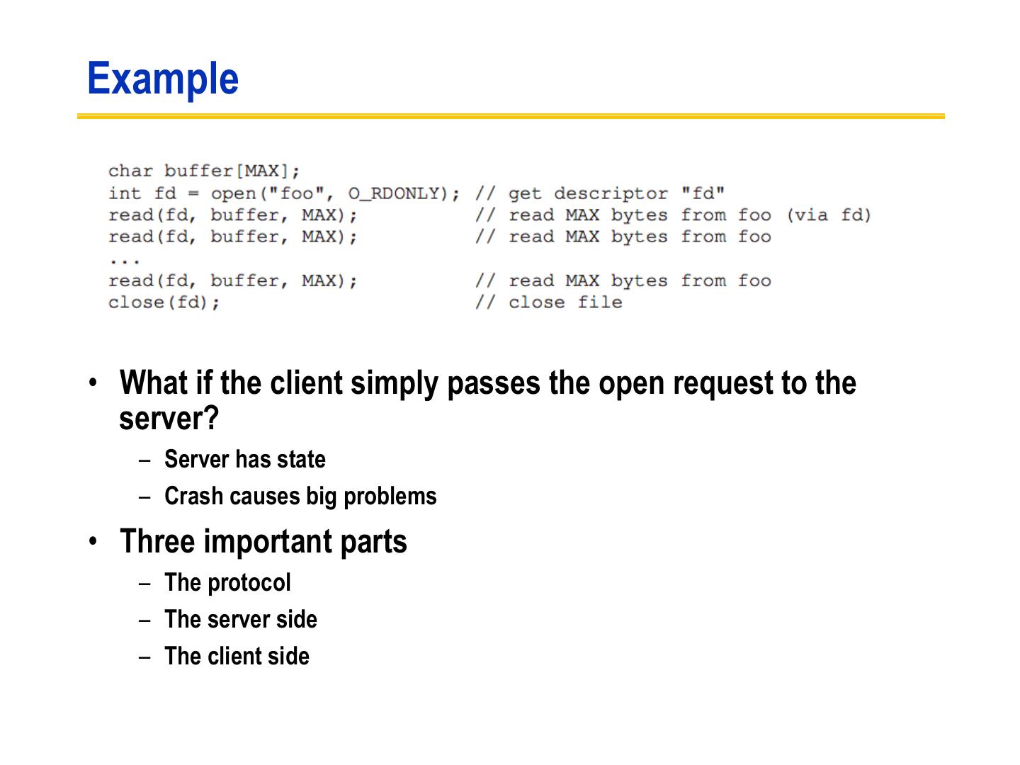 6 .Example • What if the client simply passes the open request to the server? – Server has state – Crash causes big problems • Three important parts – The protocol – The server side – The client side