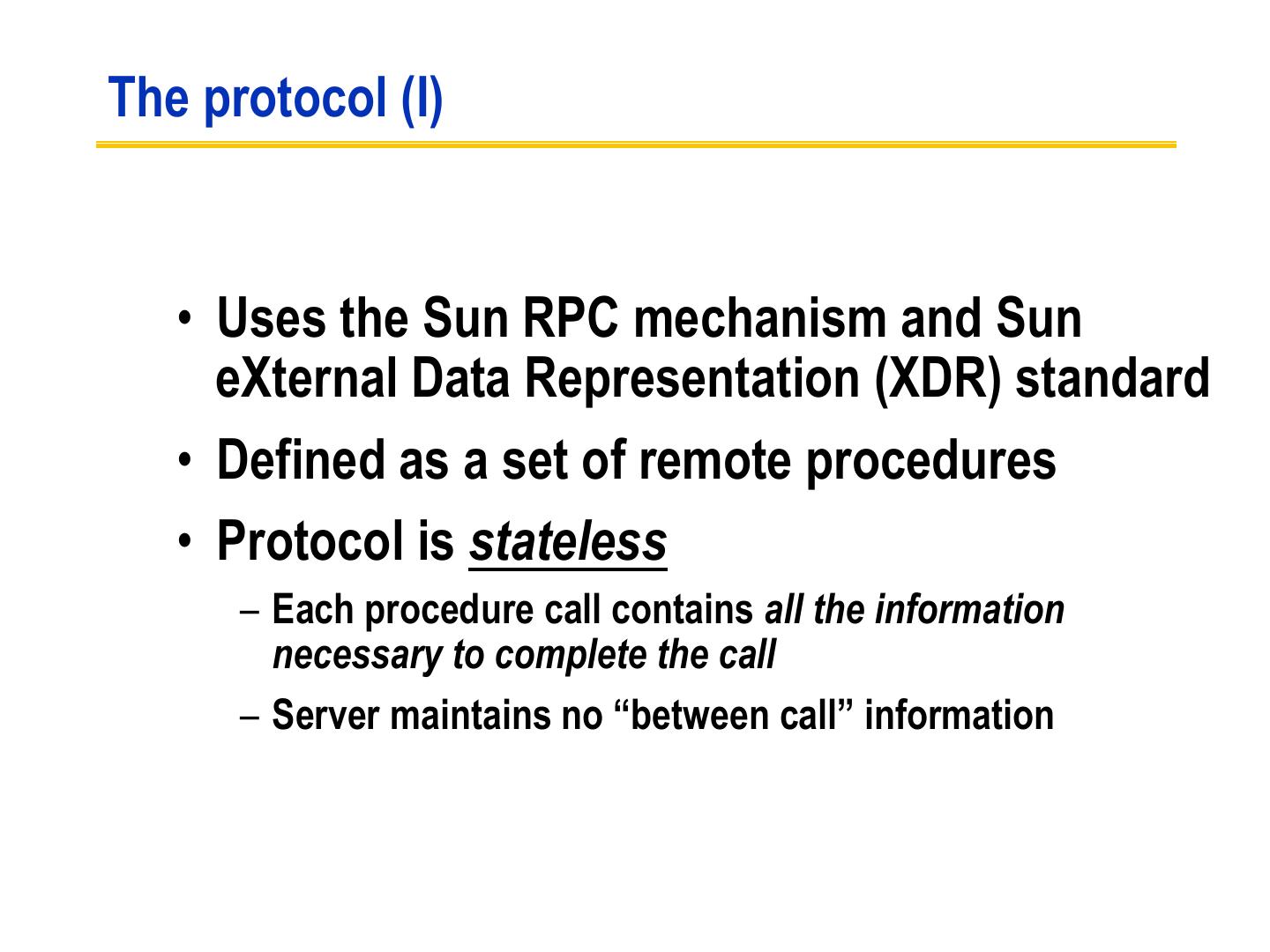 7 .The protocol (I) • Uses the Sun RPC mechanism and Sun eXternal Data Representation (XDR) standard • Defined as a set of remote procedures • Protocol is stateless – Each procedure call contains all the information necessary to complete the call – Server maintains no “between call” information
