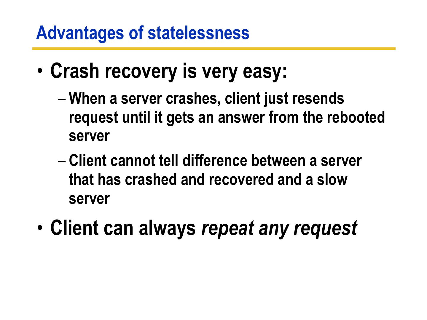8 .Advantages of statelessness • Crash recovery is very easy: – When a server crashes, client just resends request until it gets an answer from the rebooted server – Client cannot tell difference between a server that has crashed and recovered and a slow server • Client can always repeat any request