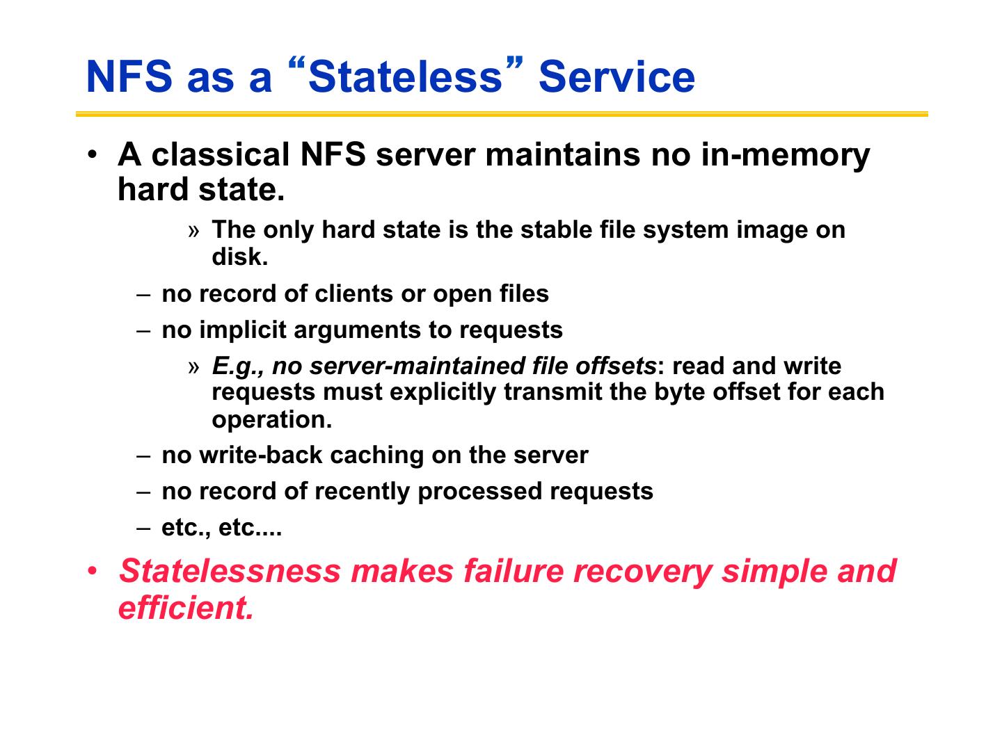 9 .NFS as a “Stateless” Service • A classical NFS server maintains no in-memory hard state. » The only hard state is the stable file system image on disk. – no record of clients or open files – no implicit arguments to requests » E.g., no server-maintained file offsets: read and write requests must explicitly transmit the byte offset for each operation. – no write-back caching on the server – no record of recently processed requests – etc., etc.... • Statelessness makes failure recovery simple and efficient.