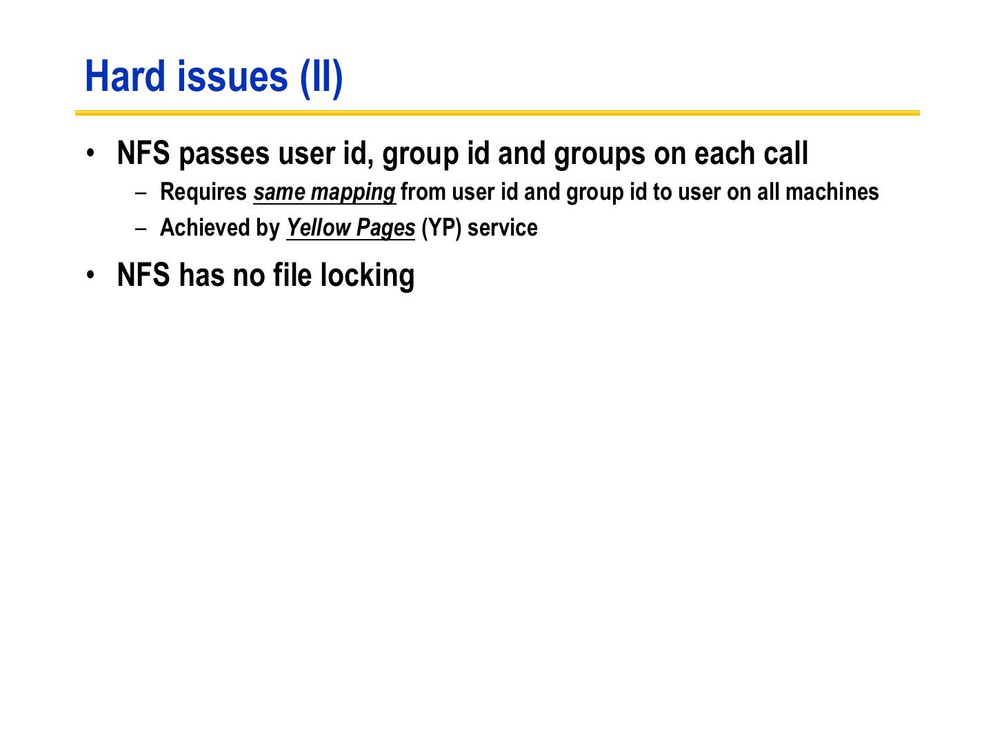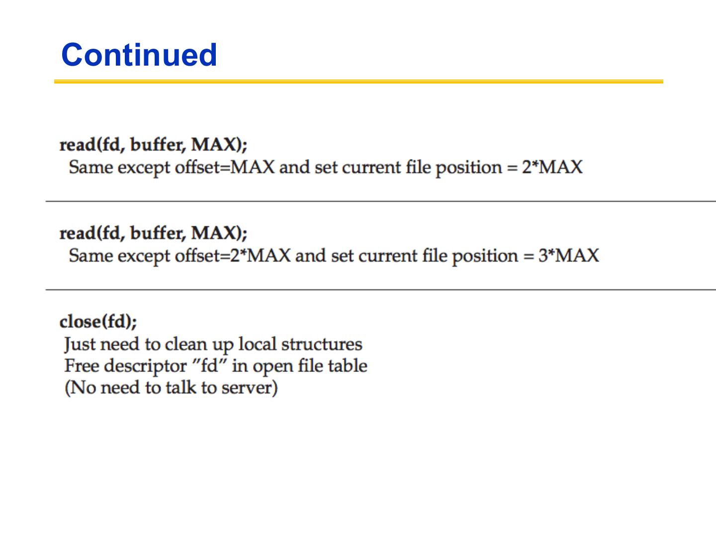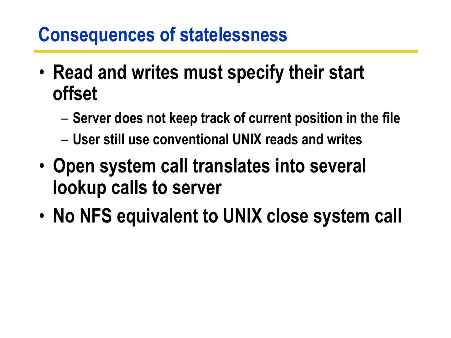 10 .Consequences of statelessness • Read and writes must specify their start offset – Server does not keep track of current position in the file – User still use conventional UNIX reads and writes • Open system call translates into several lookup calls to server • No NFS equivalent to UNIX close system call