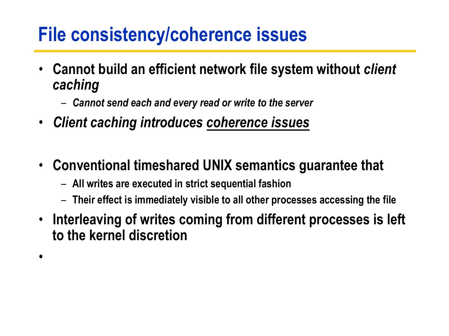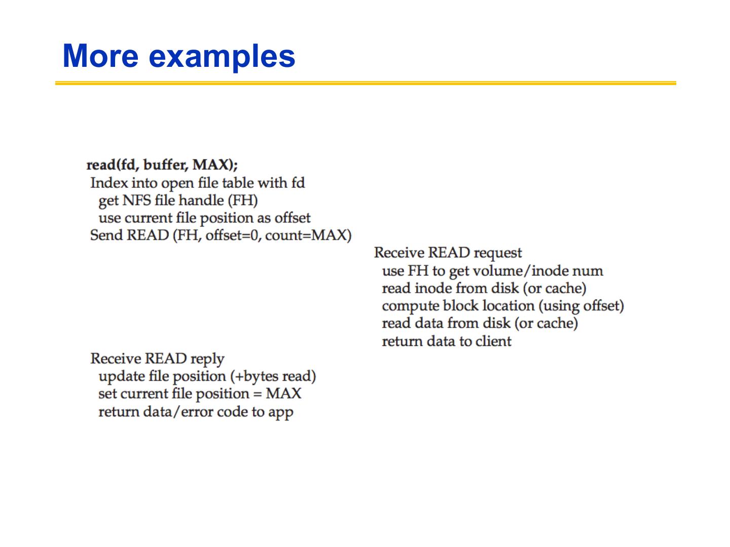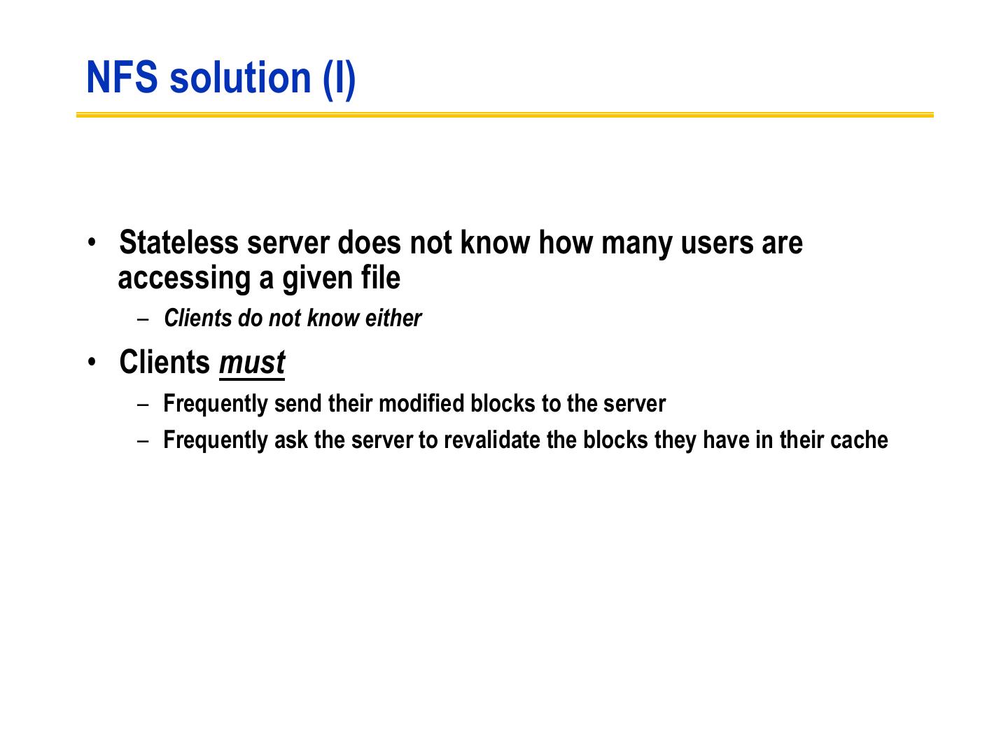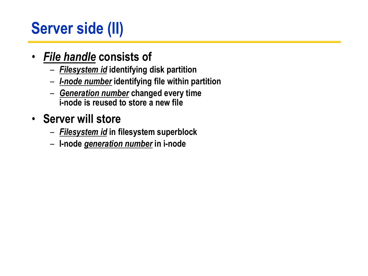 16 .Server side (II) • File handle consists of – Filesystem id identifying disk partition – I-node number identifying file within partition – Generation number changed every time i-node is reused to store a new file • Server will store – Filesystem id in filesystem superblock – I-node generation number in i-node