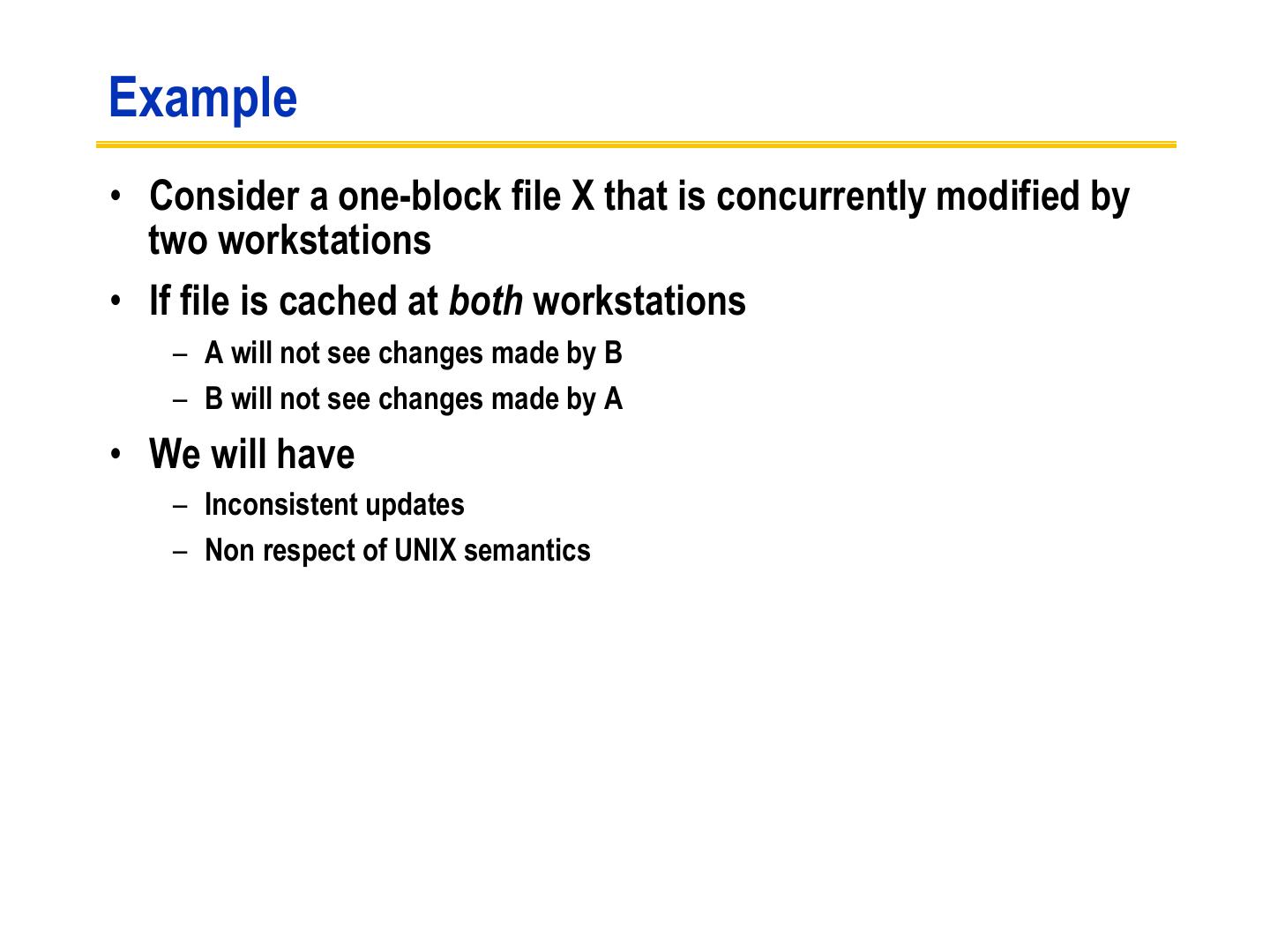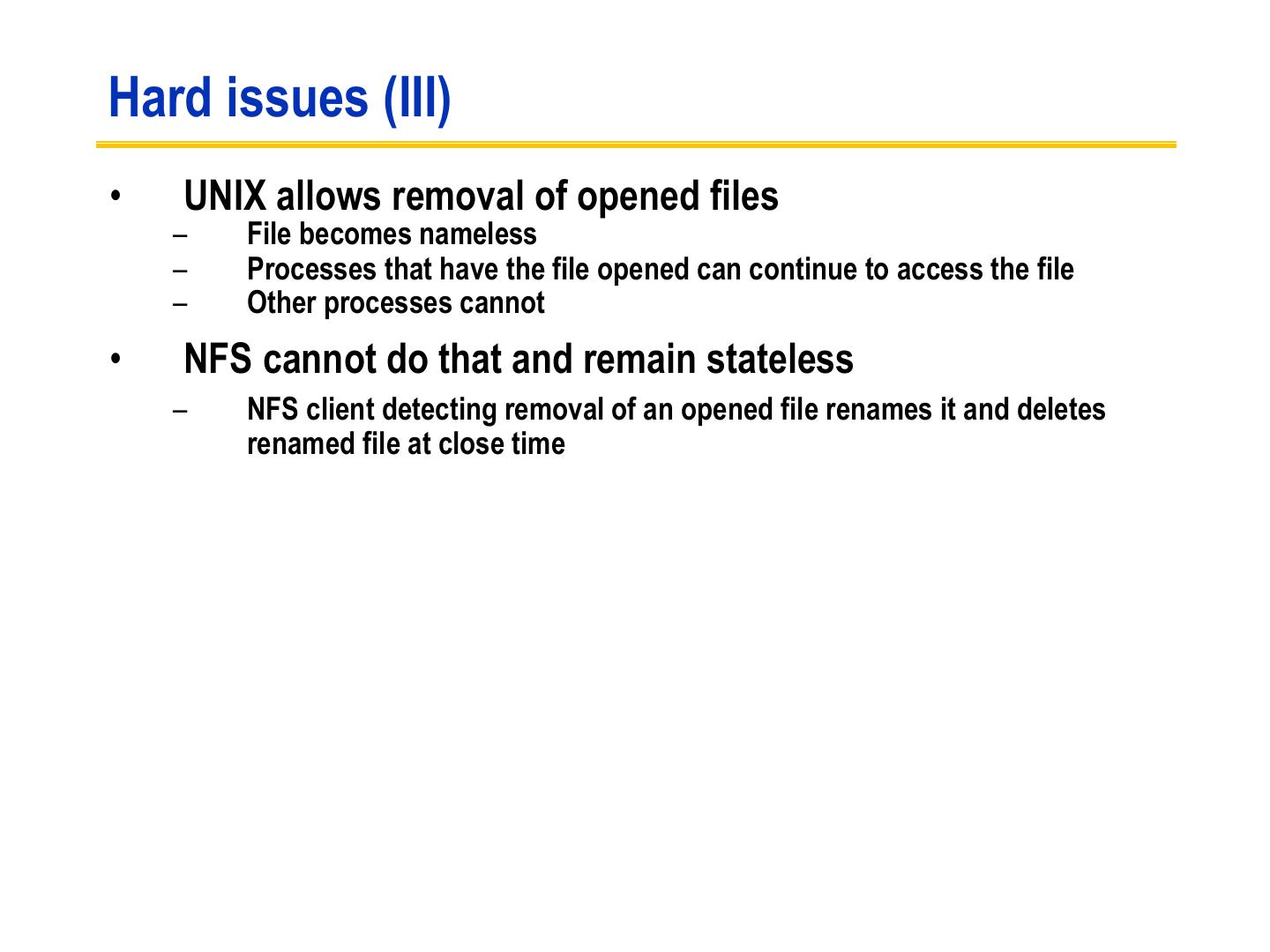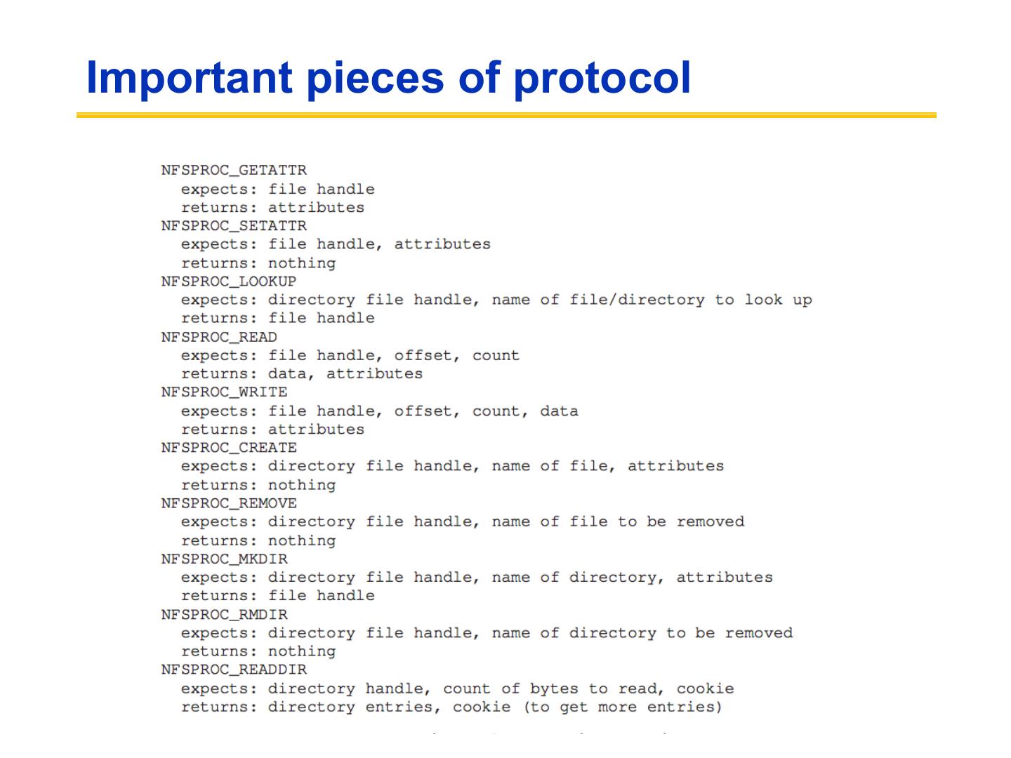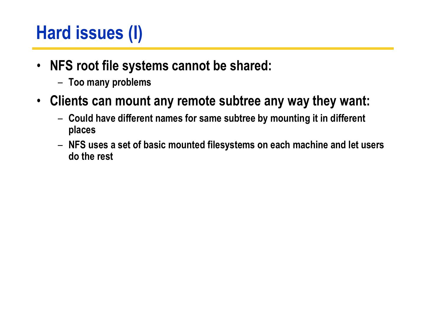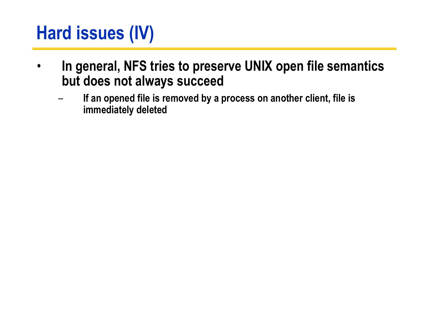 16 .Server side (II) • File handle consists of – Filesystem id identifying disk partition – I-node number identifying file within partition – Generation number changed every time i-node is reused to store a new file • Server will store – Filesystem id in filesystem superblock – I-node generation number in i-node
