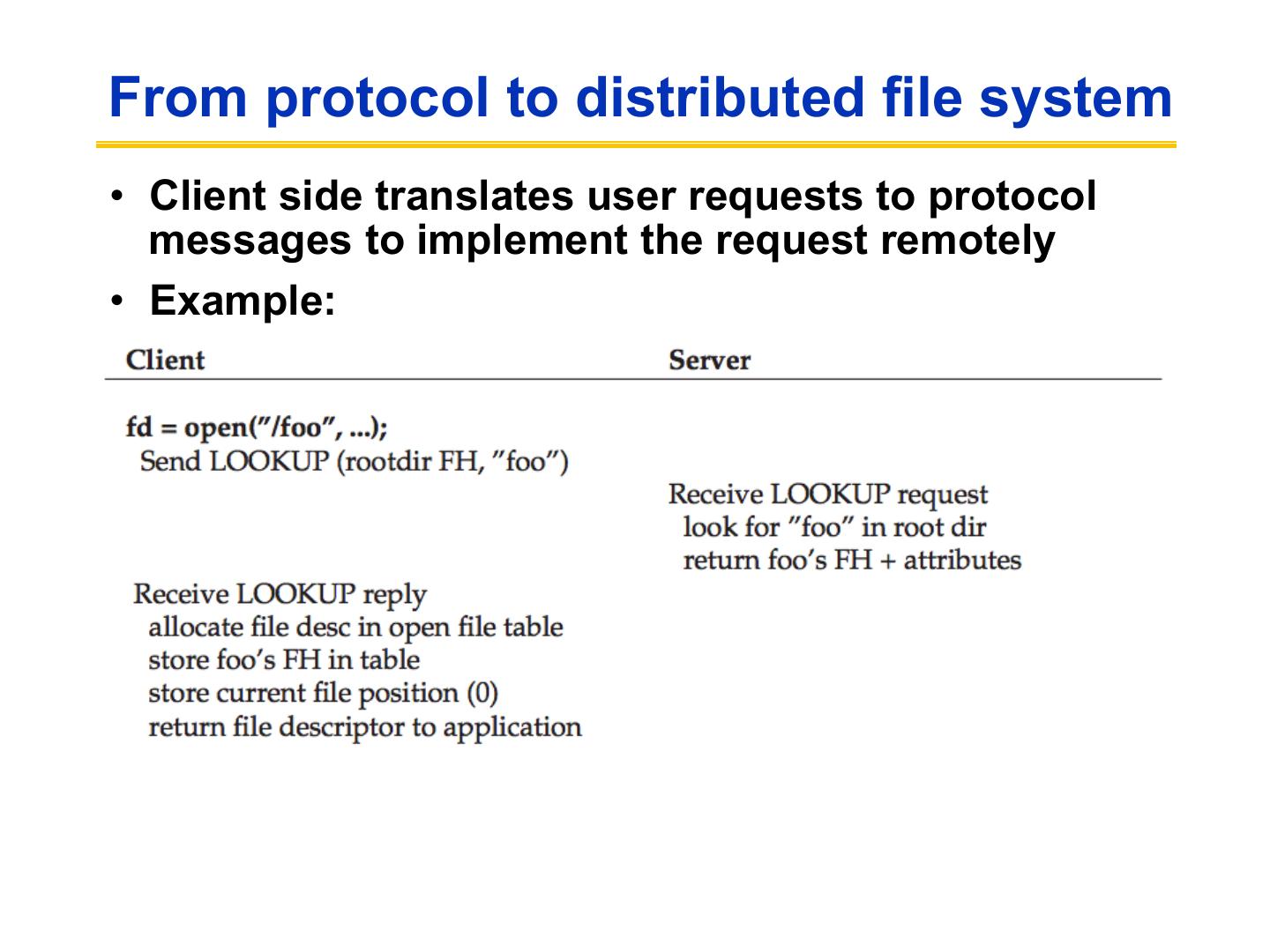 12 .From protocol to distributed file system • Client side translates user requests to protocol messages to implement the request remotely • Example: