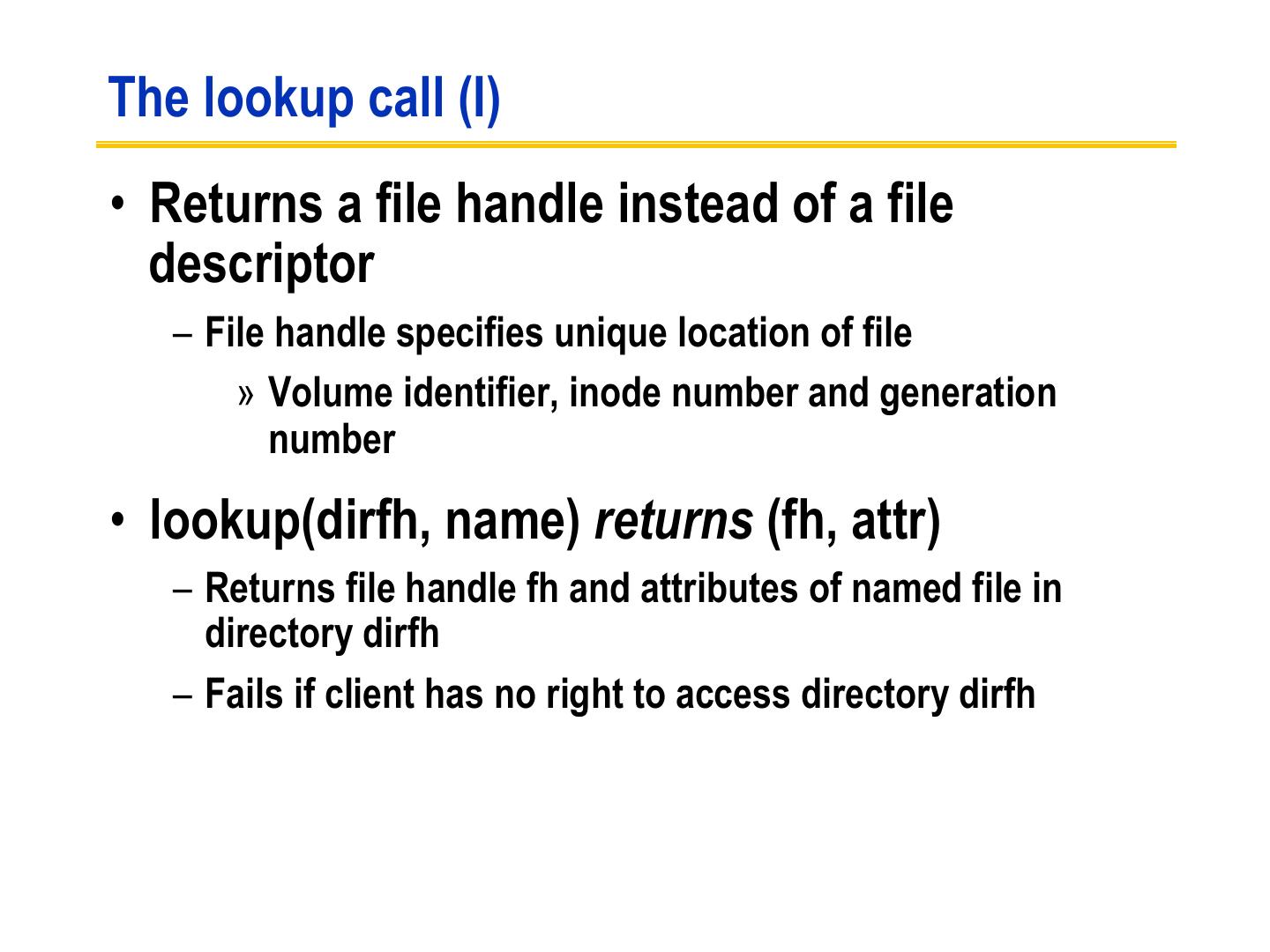13 .The lookup call (I) • Returns a file handle instead of a file descriptor – File handle specifies unique location of file » Volume identifier, inode number and generation number • lookup(dirfh, name) returns (fh, attr) – Returns file handle fh and attributes of named file in directory dirfh – Fails if client has no right to access directory dirfh