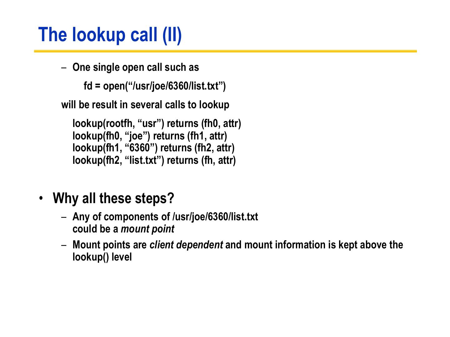 14 .The lookup call (II) – One single open call such as fd = open(“/usr/joe/6360/list.txt”) will be result in several calls to lookup lookup(rootfh, “usr”) returns (fh0, attr) lookup(fh0, “joe”) returns (fh1, attr) lookup(fh1, “6360”) returns (fh2, attr) lookup(fh2, “list.txt”) returns (fh, attr) • Why all these steps? – Any of components of /usr/joe/6360/list.txt could be a mount point – Mount points are client dependent and mount information is kept above the lookup() level