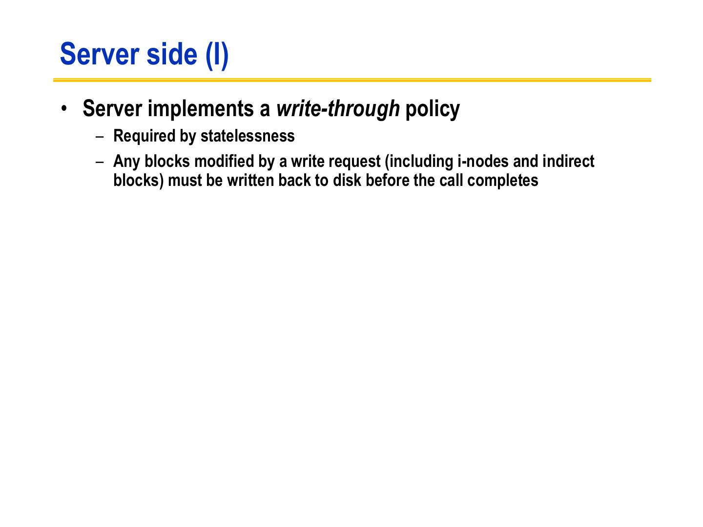 15 .Server side (I) • Server implements a write-through policy – Required by statelessness – Any blocks modified by a write request (including i-nodes and indirect blocks) must be written back to disk before the call completes