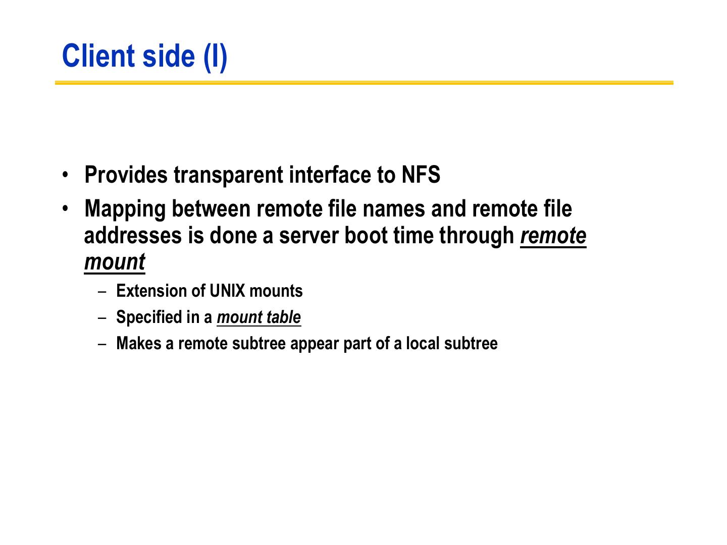 17 .Client side (I) • Provides transparent interface to NFS • Mapping between remote file names and remote file addresses is done a server boot time through remote mount – Extension of UNIX mounts – Specified in a mount table – Makes a remote subtree appear part of a local subtree