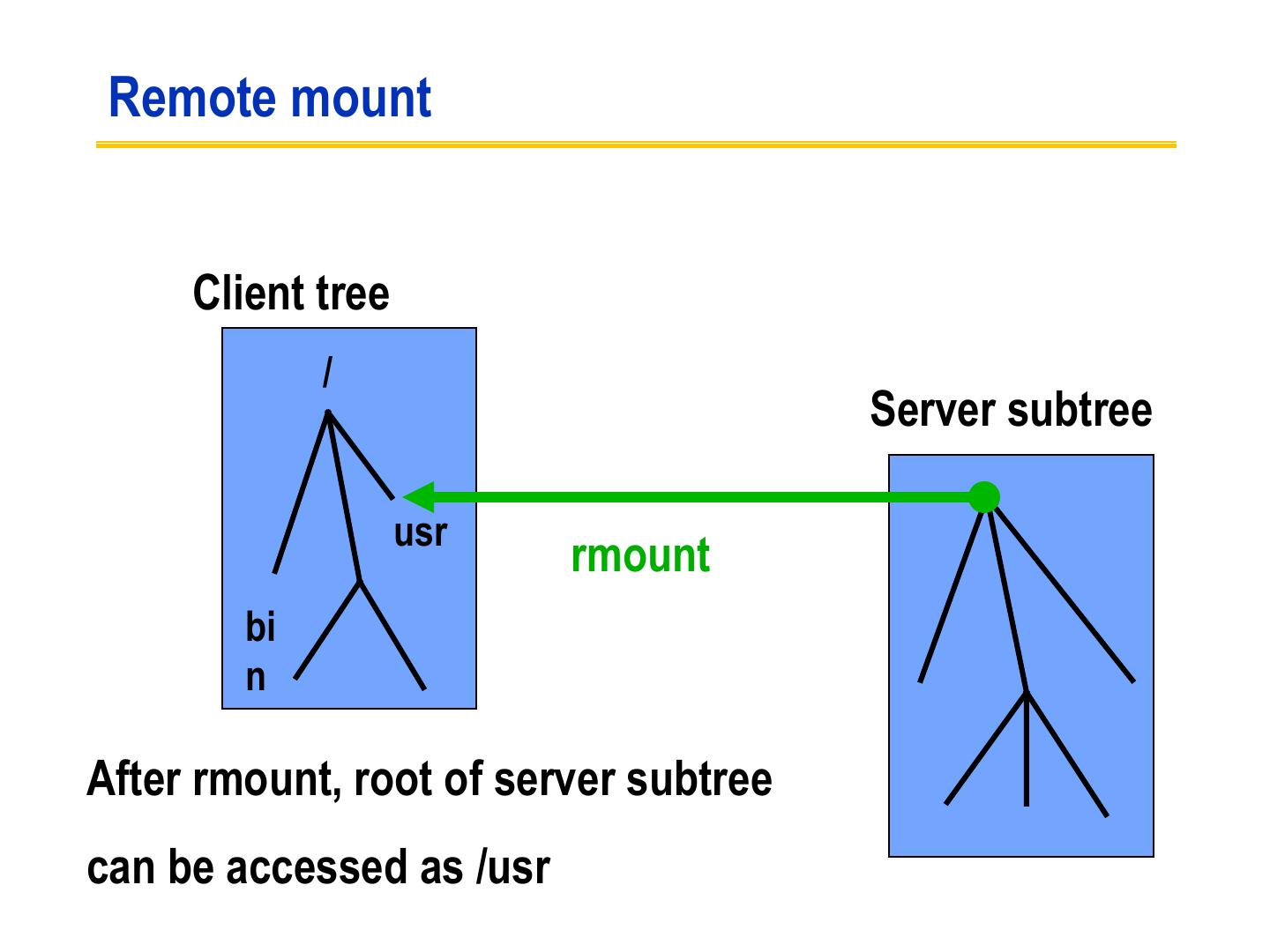 18 . Remote mount Client tree / Server subtree usr rmount bi n After rmount, root of server subtree can be accessed as /usr