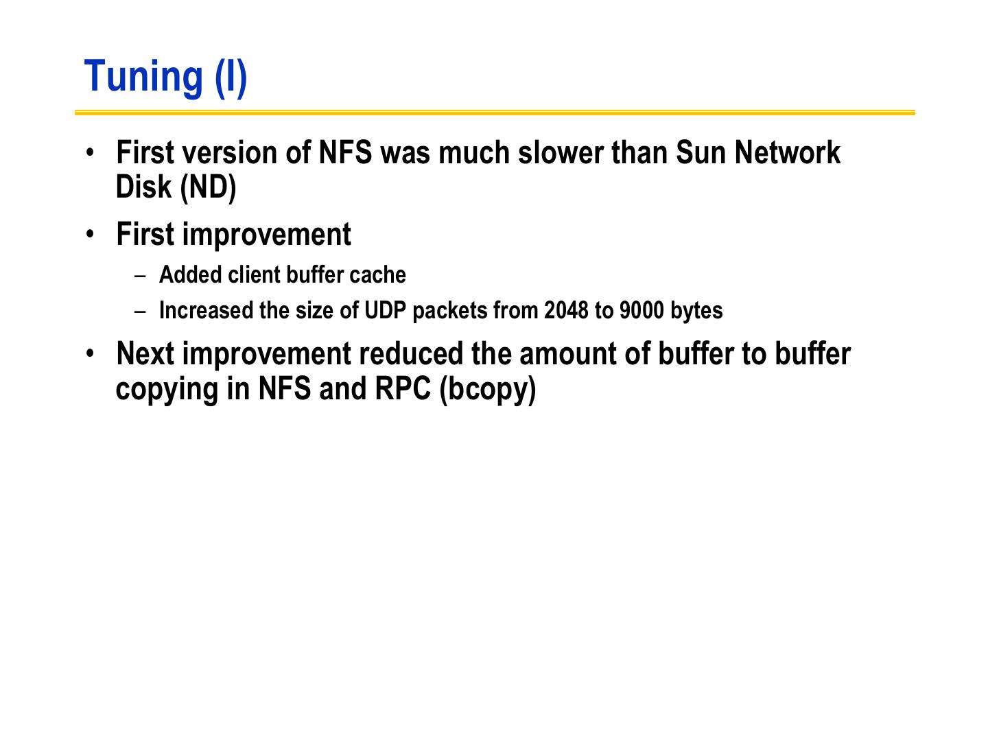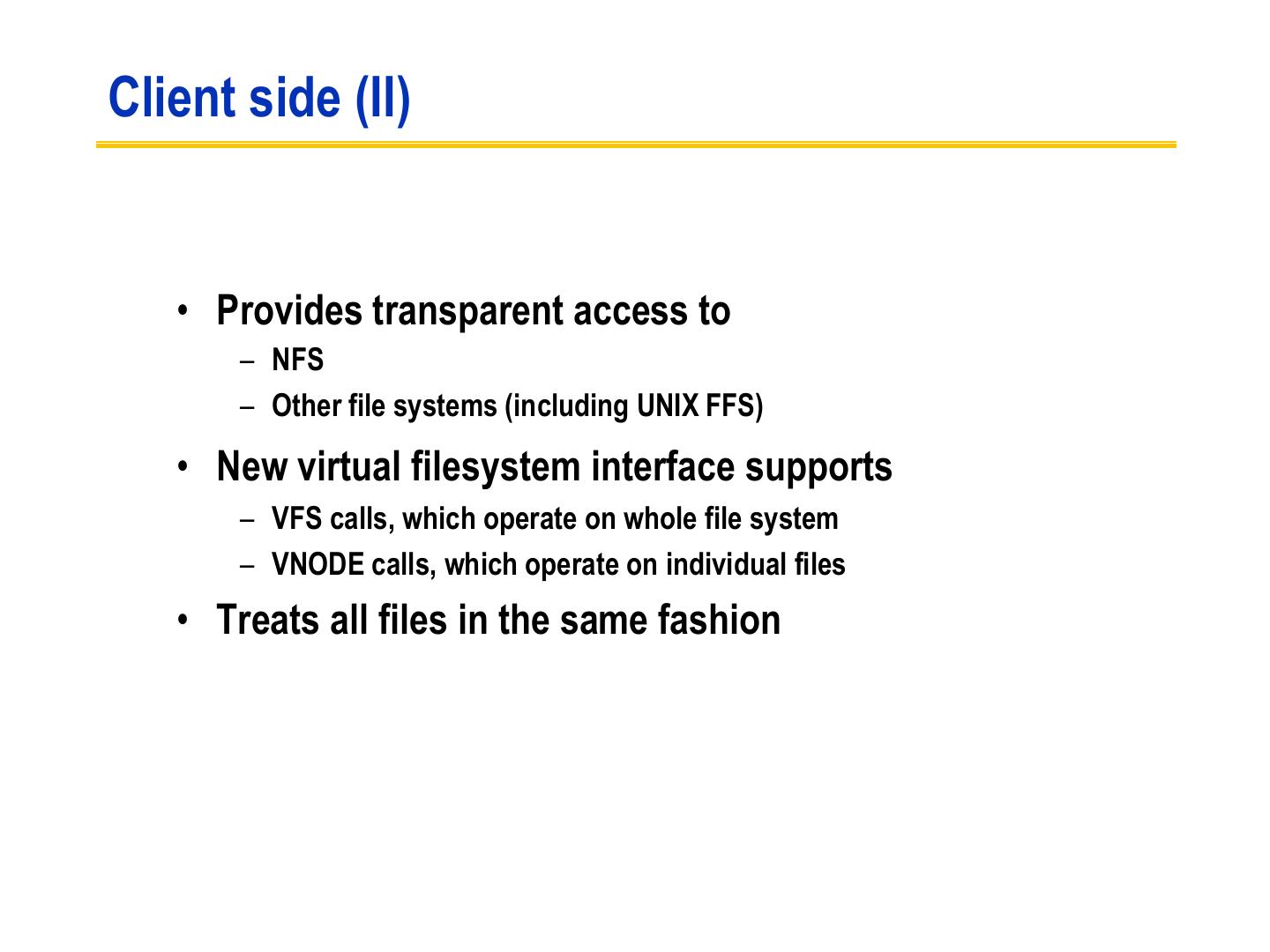 19 .Client side (II) • Provides transparent access to – NFS – Other file systems (including UNIX FFS) • New virtual filesystem interface supports – VFS calls, which operate on whole file system – VNODE calls, which operate on individual files • Treats all files in the same fashion