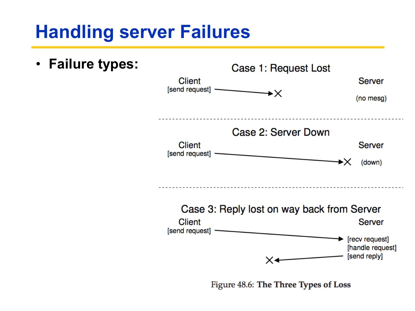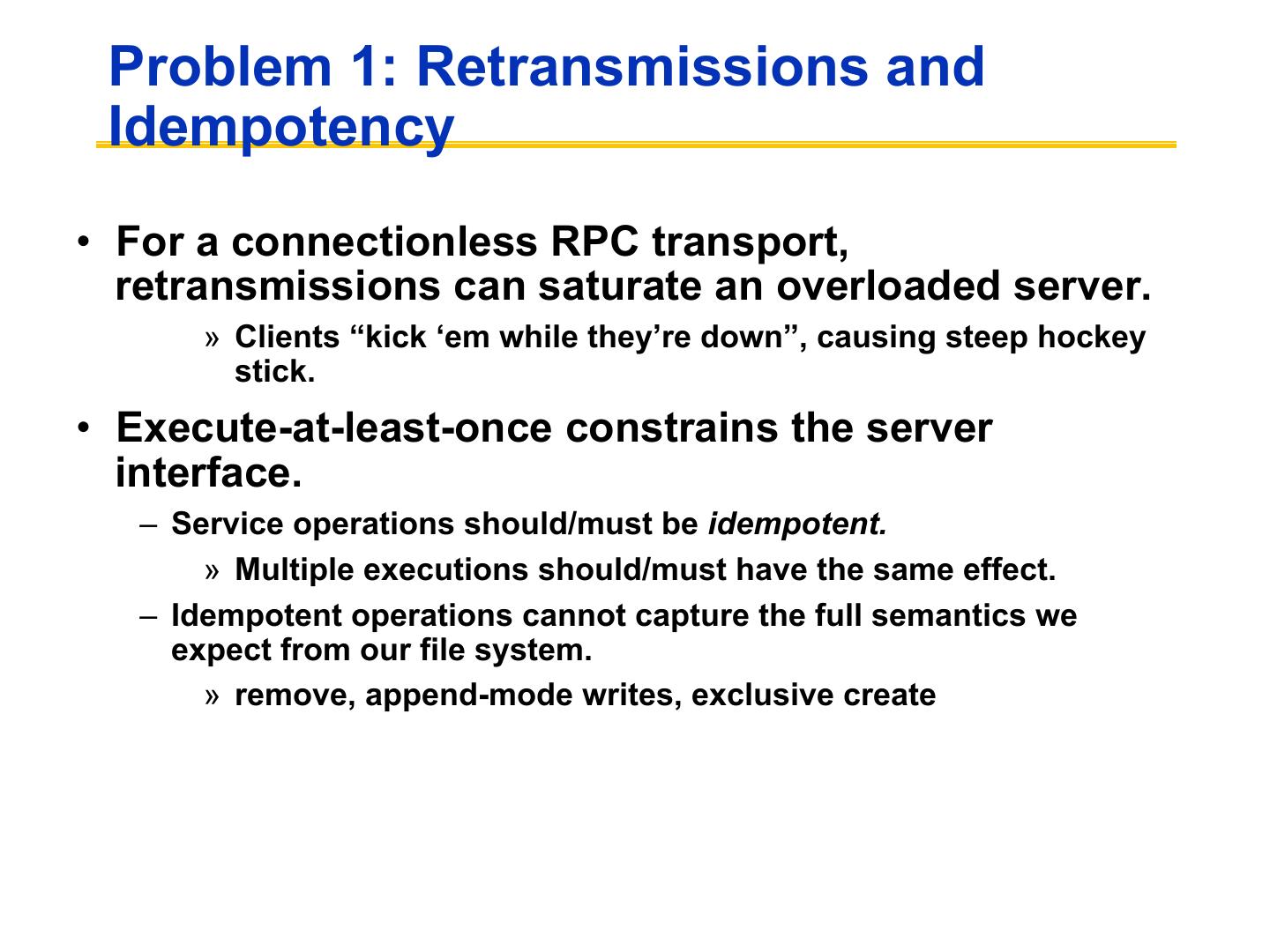 26 . Problem 1: Retransmissions and Idempotency • For a connectionless RPC transport, retransmissions can saturate an overloaded server. » Clients “kick ‘em while they’re down”, causing steep hockey stick. • Execute-at-least-once constrains the server interface. – Service operations should/must be idempotent. » Multiple executions should/must have the same effect. – Idempotent operations cannot capture the full semantics we expect from our file system. » remove, append-mode writes, exclusive create