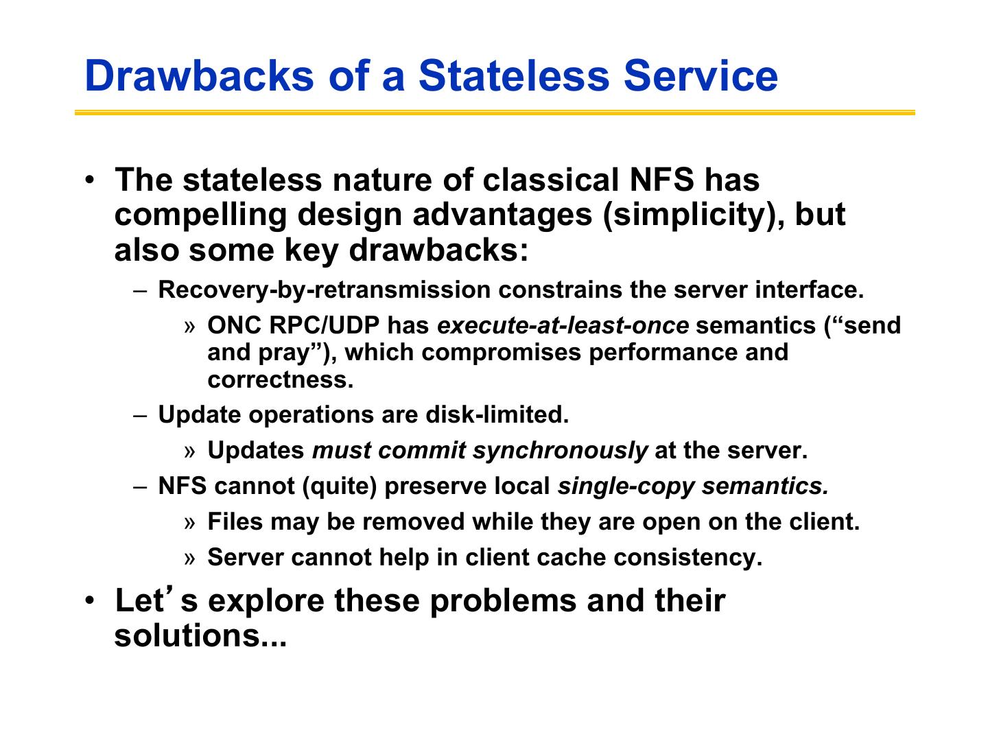 25 .Drawbacks of a Stateless Service • The stateless nature of classical NFS has compelling design advantages (simplicity), but also some key drawbacks: – Recovery-by-retransmission constrains the server interface. » ONC RPC/UDP has execute-at-least-once semantics (“send and pray”), which compromises performance and correctness. – Update operations are disk-limited. » Updates must commit synchronously at the server. – NFS cannot (quite) preserve local single-copy semantics. » Files may be removed while they are open on the client. » Server cannot help in client cache consistency. • Let’s explore these problems and their solutions...