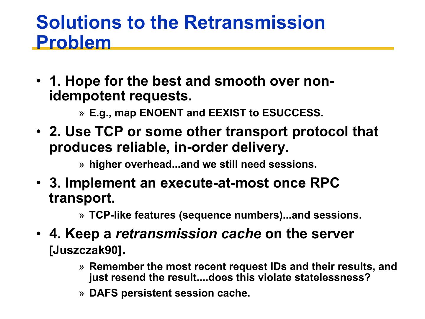 27 .Solutions to the Retransmission Problem • 1. Hope for the best and smooth over non- idempotent requests. » E.g., map ENOENT and EEXIST to ESUCCESS. • 2. Use TCP or some other transport protocol that produces reliable, in-order delivery. » higher overhead...and we still need sessions. • 3. Implement an execute-at-most once RPC transport. » TCP-like features (sequence numbers)...and sessions. • 4. Keep a retransmission cache on the server [Juszczak90]. » Remember the most recent request IDs and their results, and just resend the result....does this violate statelessness? » DAFS persistent session cache.