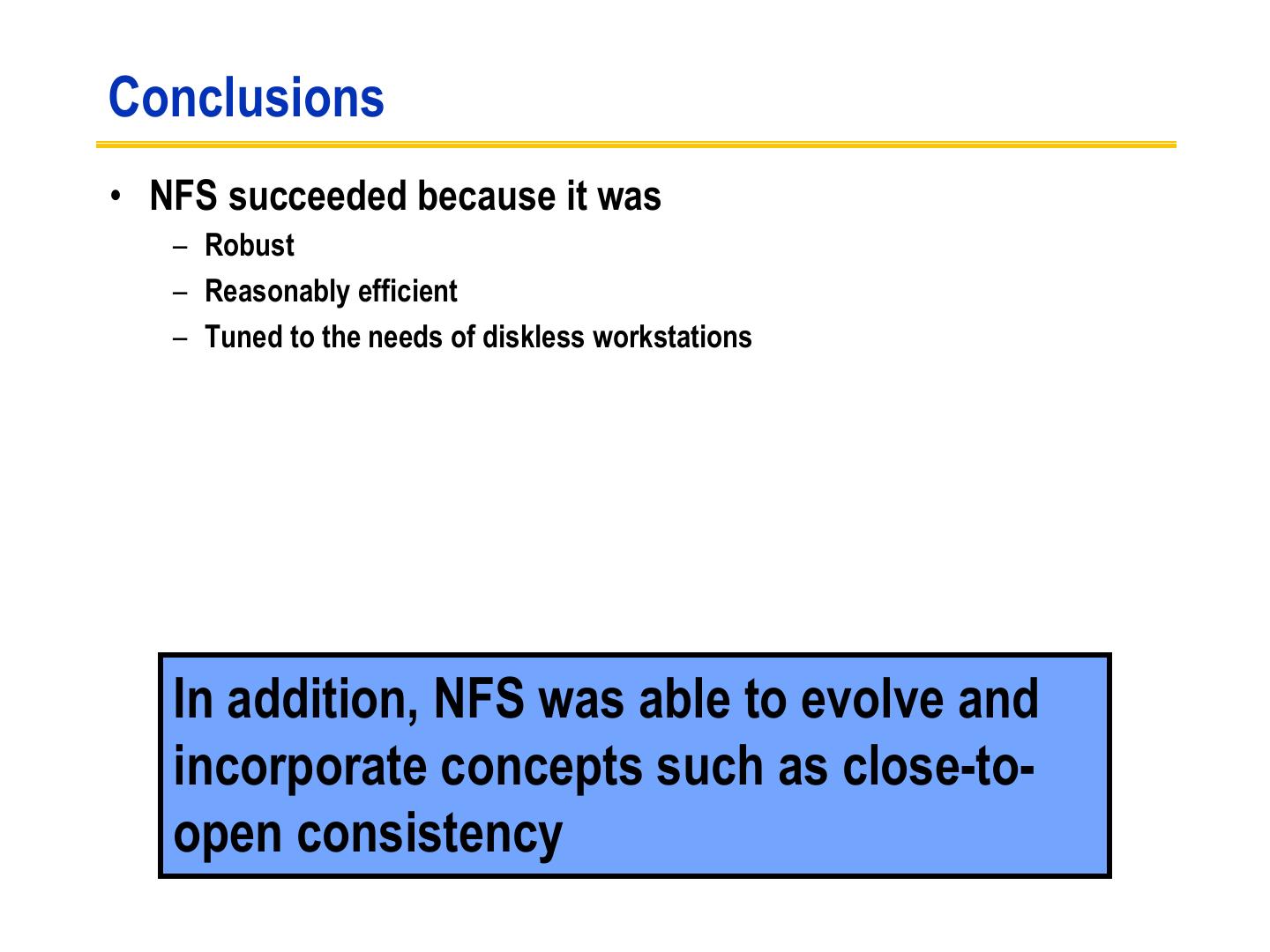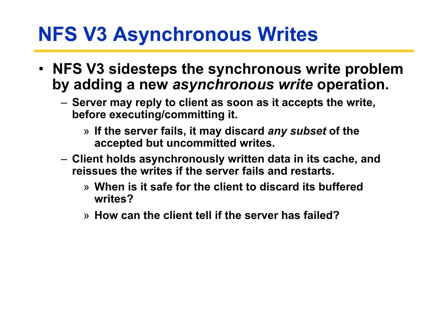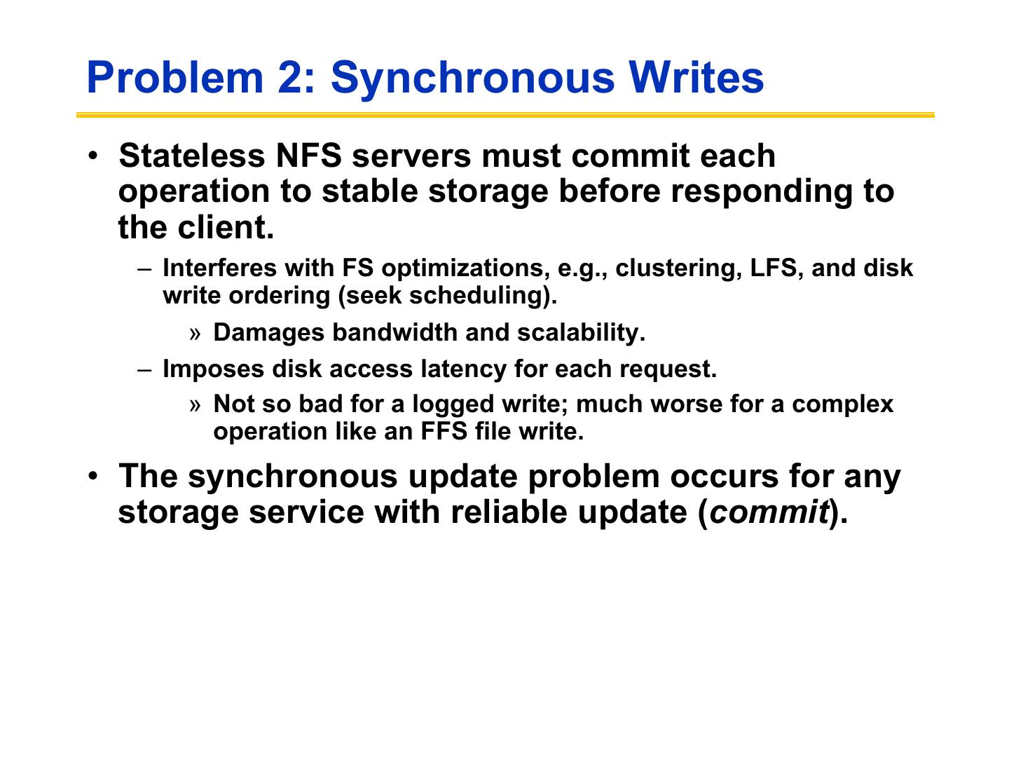 28 .Problem 2: Synchronous Writes • Stateless NFS servers must commit each operation to stable storage before responding to the client. – Interferes with FS optimizations, e.g., clustering, LFS, and disk write ordering (seek scheduling). » Damages bandwidth and scalability. – Imposes disk access latency for each request. » Not so bad for a logged write; much worse for a complex operation like an FFS file write. • The synchronous update problem occurs for any storage service with reliable update (commit).